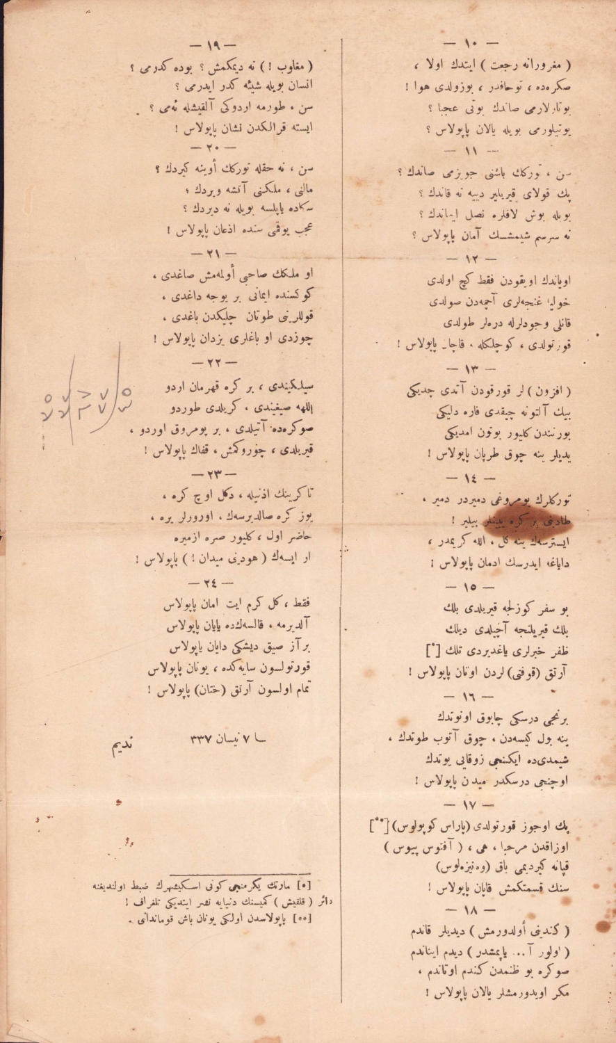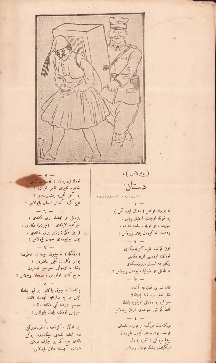Yunan Ordusu Baş Kumandanı Papalos ile alakalı yazılmış "Papalos'a Destan", Osmanlıca, 2 sayfa, 20x33,5 cm.