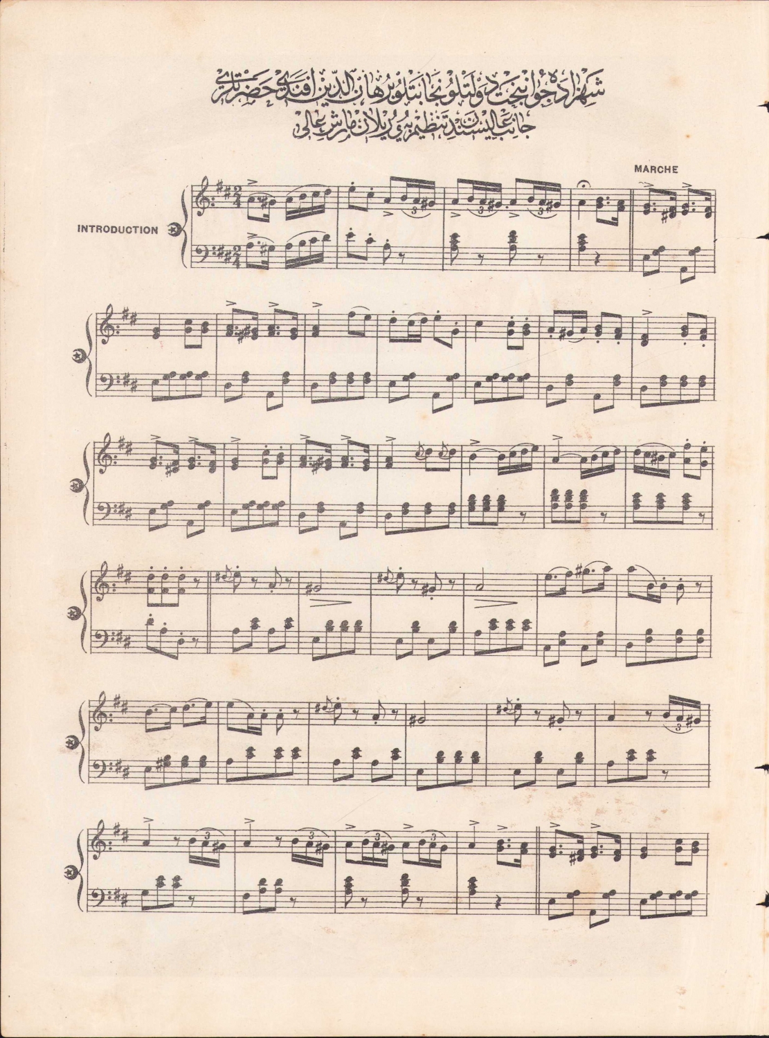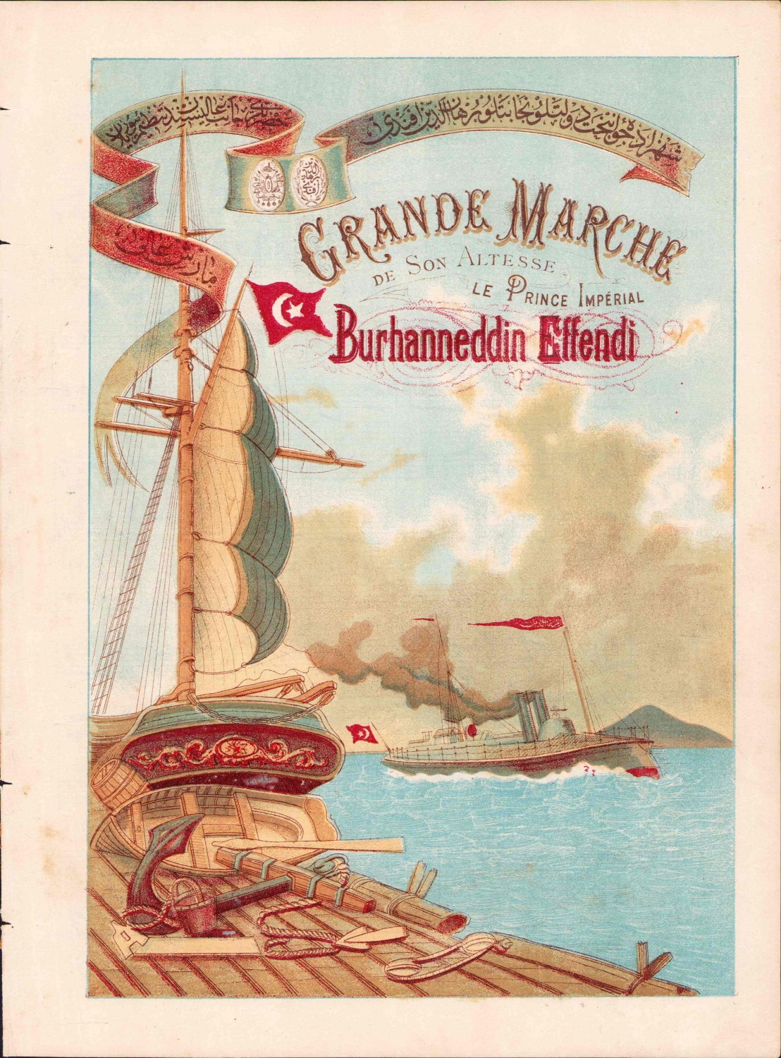 Şehzade Burhaneddin Efendi tarafından tanzim edilmiş Marş-ı Ali [Grande Marche], Osmanlıca ve Fransızca, 4 sayfa, 24x32,5 cm.