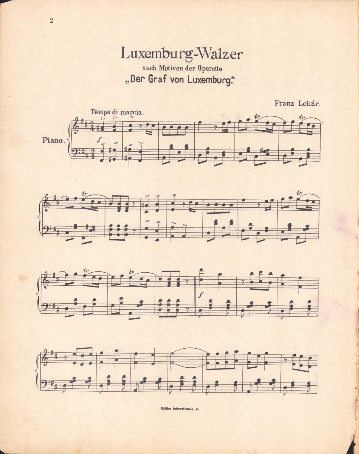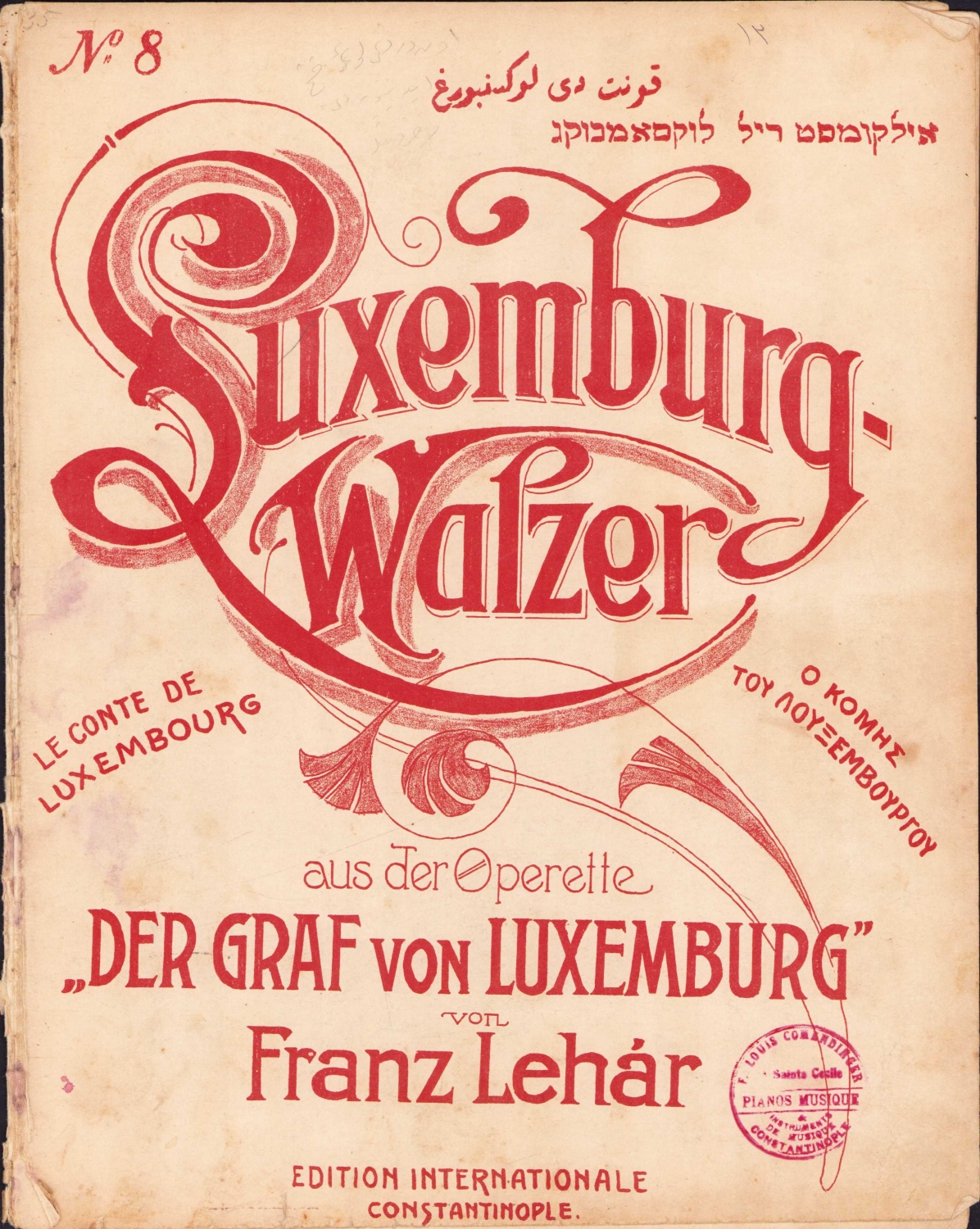 Luxemburg Walzer, Der Graf von Luxemburg, İbranice, Rumca ve Fransızca, Edition Internationale Constantinople, Musiki Mağazası F. Louis Comendinger damgalı, 11 sayfa, 26x34 cm.