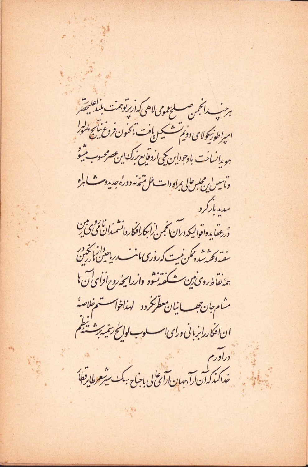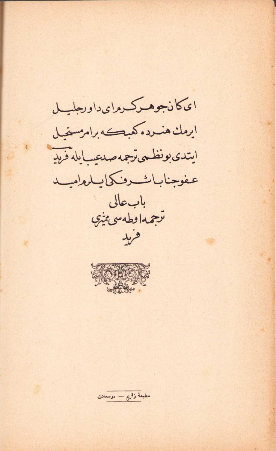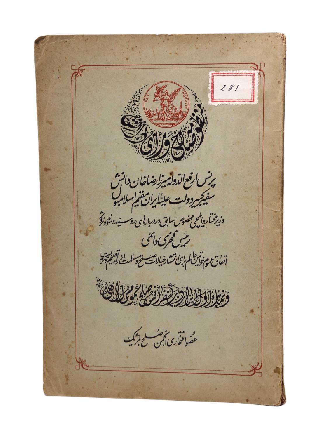Mirza Rıza Han'ın Lahey Konferansı Dolayısıyla yazdığı Manzume-i Sulh-ı Lahey isimli eser ve Osmanlıca tercümesi, Matbaa-i Zelliç, Osmanlıca ve Farsça, 30 sayfa, 15,5x23,5 cm.