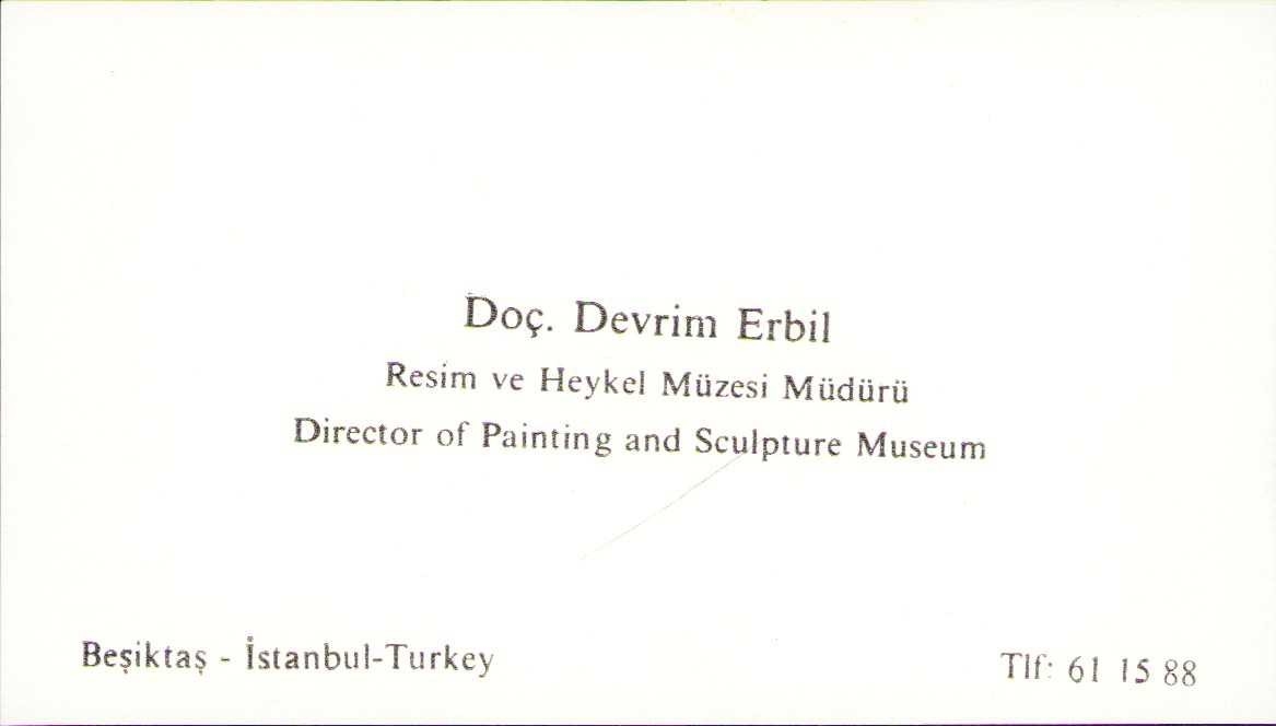 Devrim Erbil'e ait kartvizit, "Doç. Devrim Erbil, Resim Heykel Müzesi Müdürü, Beşiktaş/İstanbul, 10x5,5 cm.