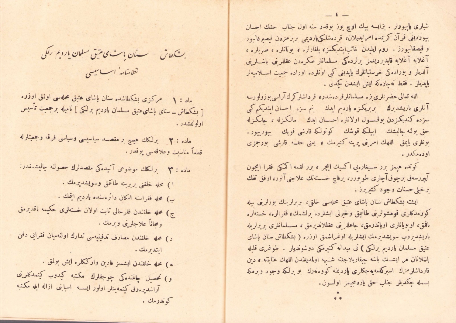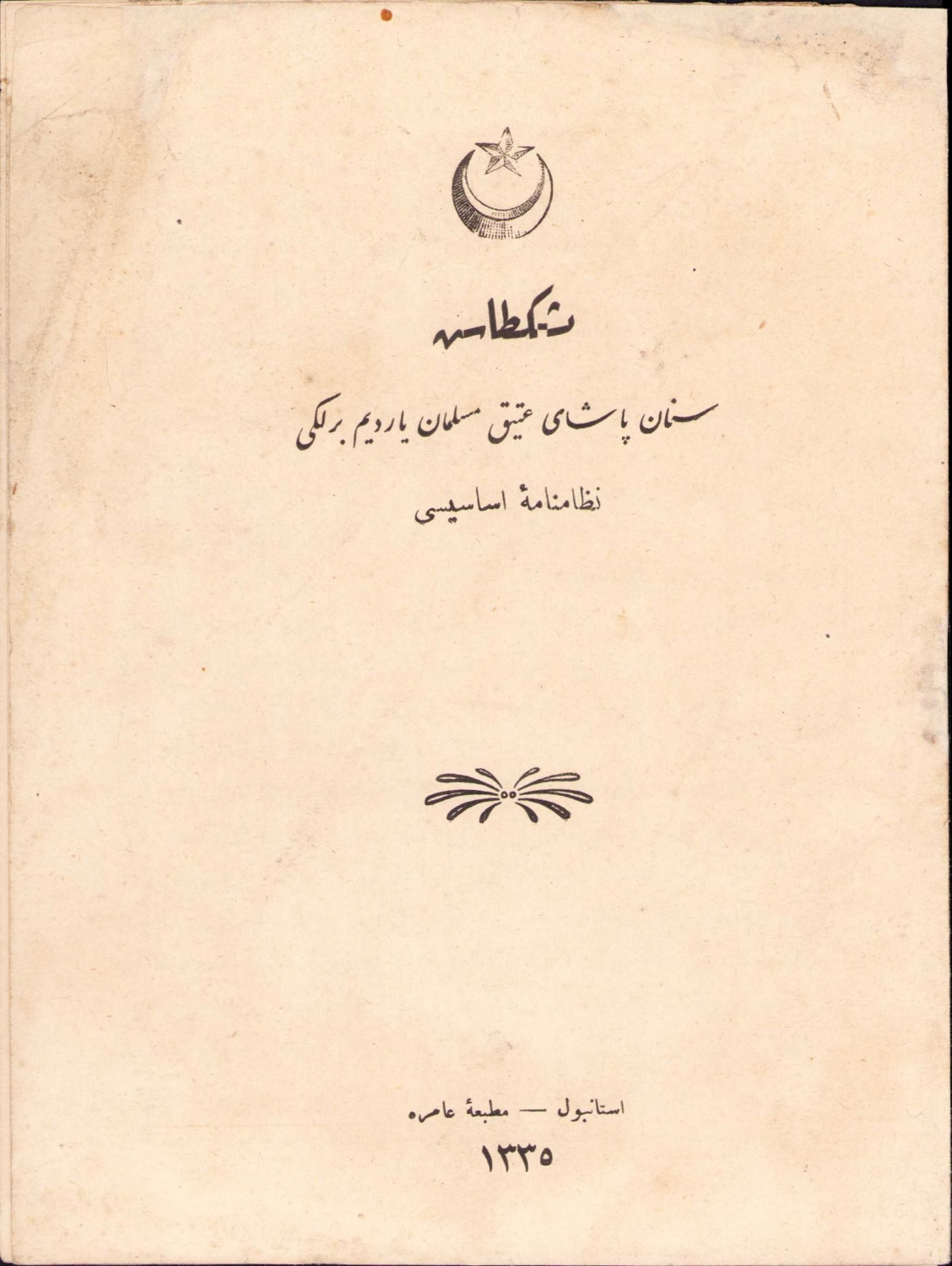 Beşiktaş Sinan Paşa-yı Atik Müslüman Yardım Birliği Nizamname-i Esasisi, İstanbul, Matbaa-i Amire, 1335 tarihli, 11 sayfa, 15x20 cm.