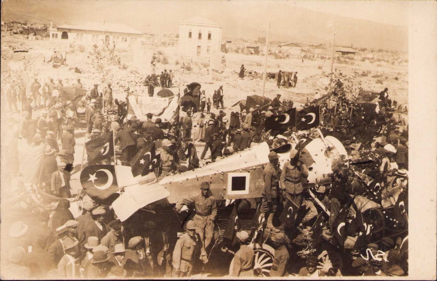 İzmir'in kurtuluş günü kutlamaları, Tayyare etrafında Türk Bayraklı siviller ve askerler, 9 Eylül 1928.