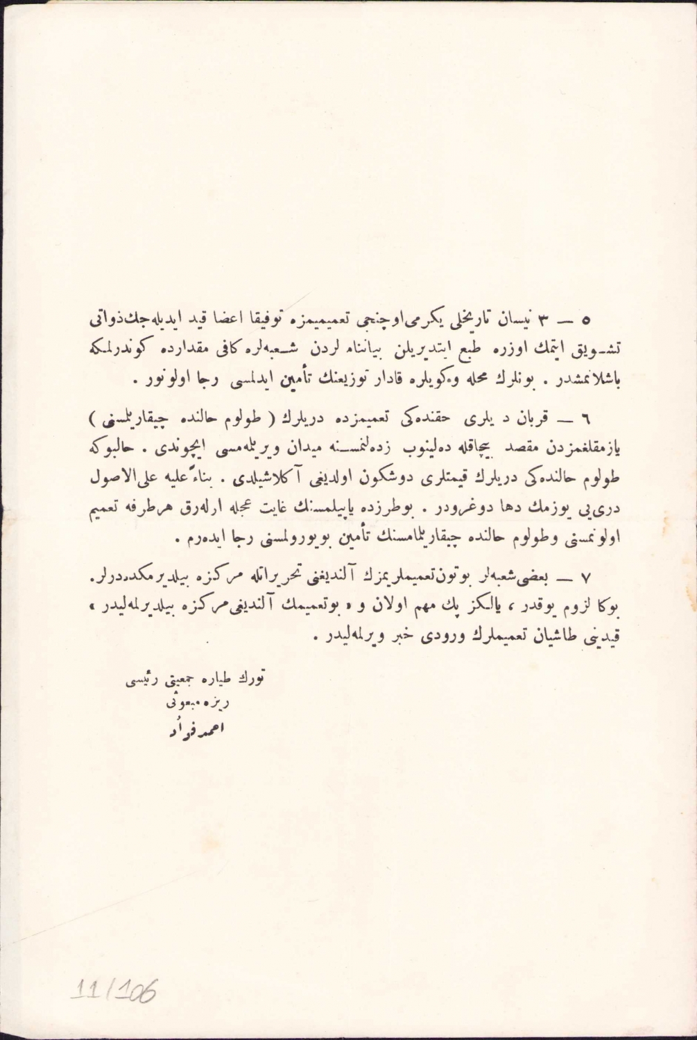 Genelge metni, Türk Tayyare Cemiyeti Reisi Rize Meb'usu Ahmed Fuad'a aittir.