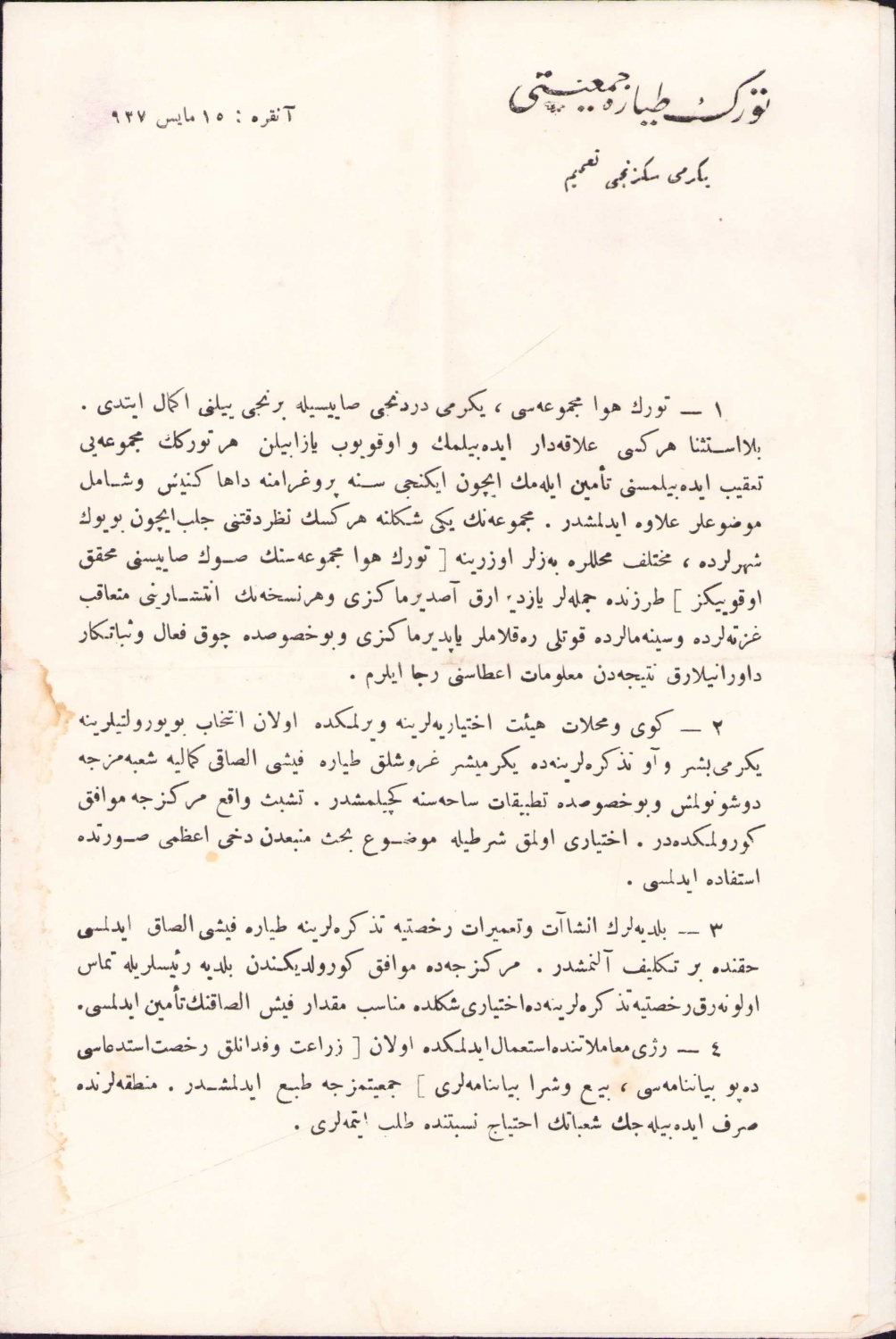 Türk Tayyare Cemiyeti Cemiyeti Yirmi Sekizinci Tamimi [Genelge] metni, Ankara, 15 Mayıs 1927 tarihli, 2 sayfa, 16x24 cm.