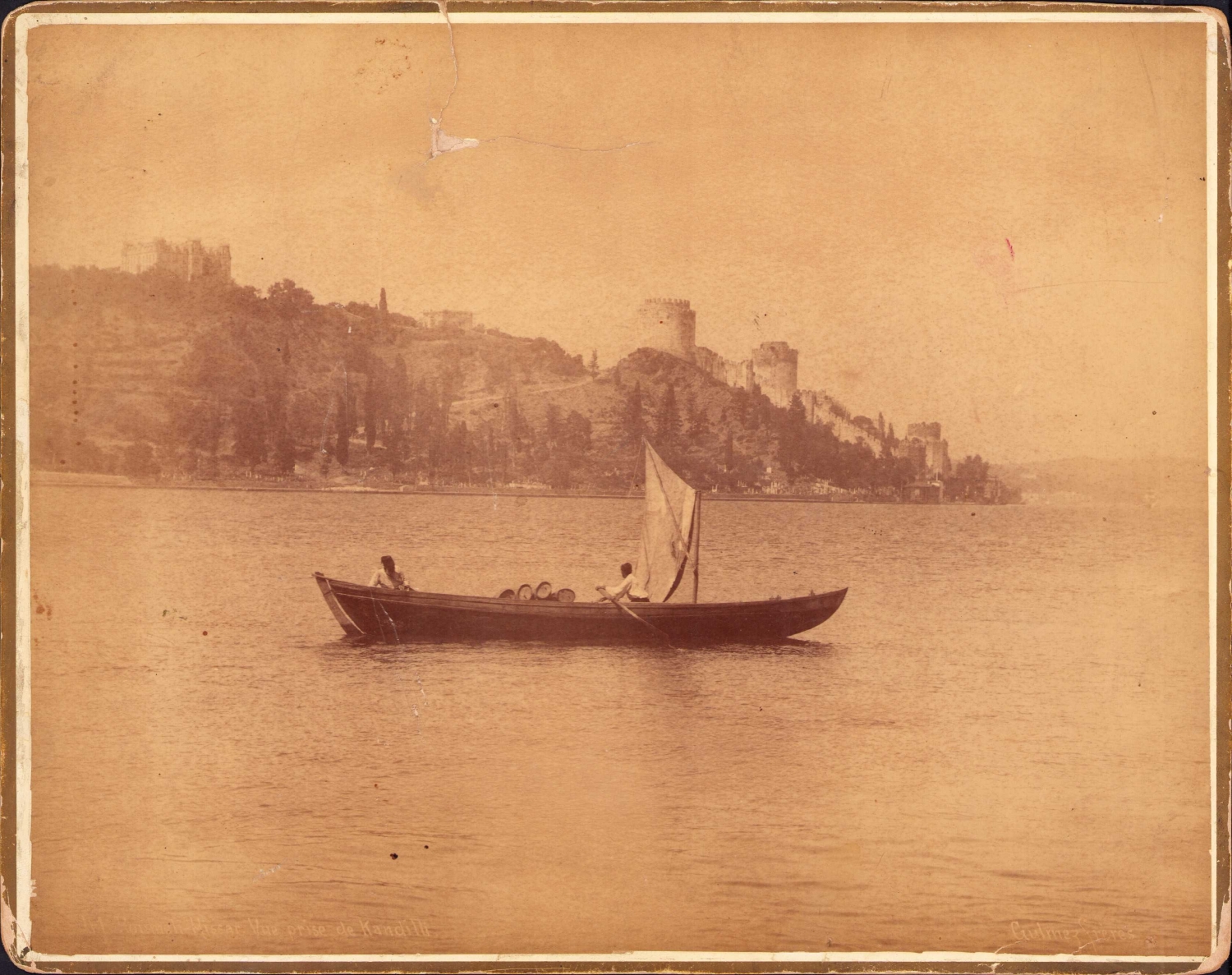 Osmanlı dönemi sepya fotoğraf, Rumeli Hisarı ve Kandilli, İstanbul Boğazı, Gülmez Freres, 28,5x23 cm.
