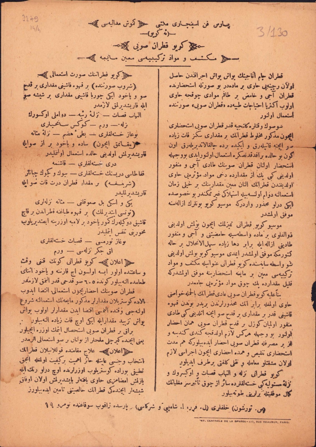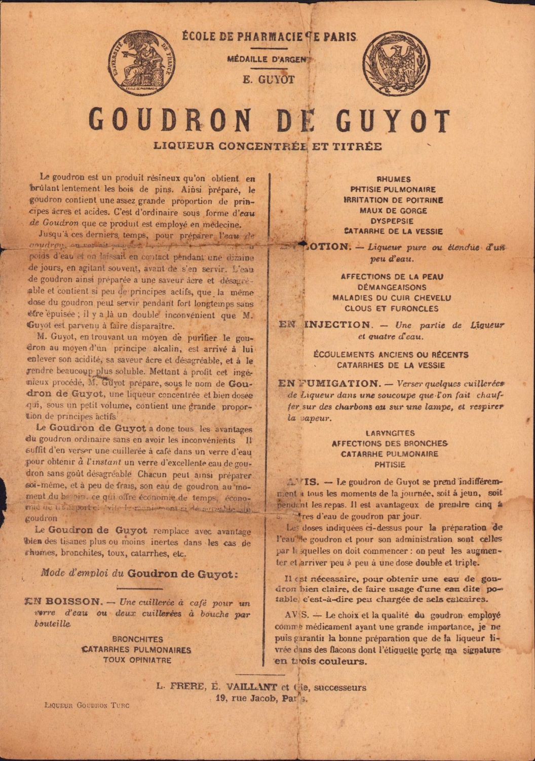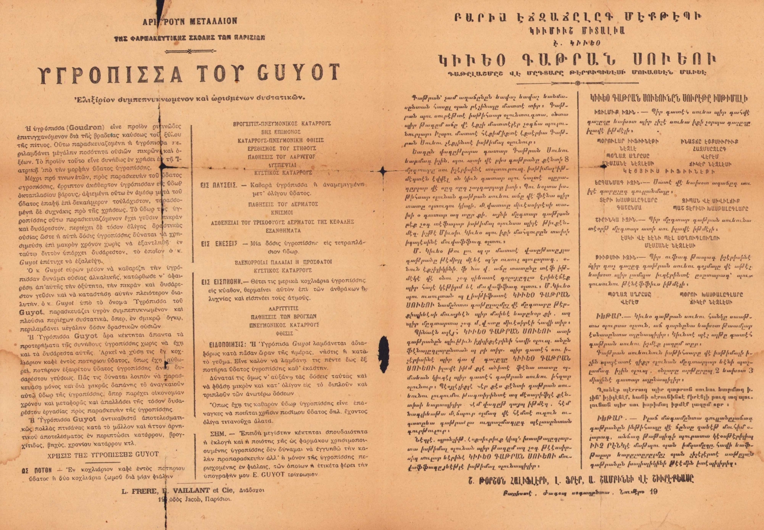 Paris İspençari Mektebi Gümüş Madalyası E. Guyot Katran Suyu tanıtım broşürü, Paris, Osmanlıca, Ermenice, Rumca ve Fransızca, 4 sayfa, haliyle,19,5x27 cm.