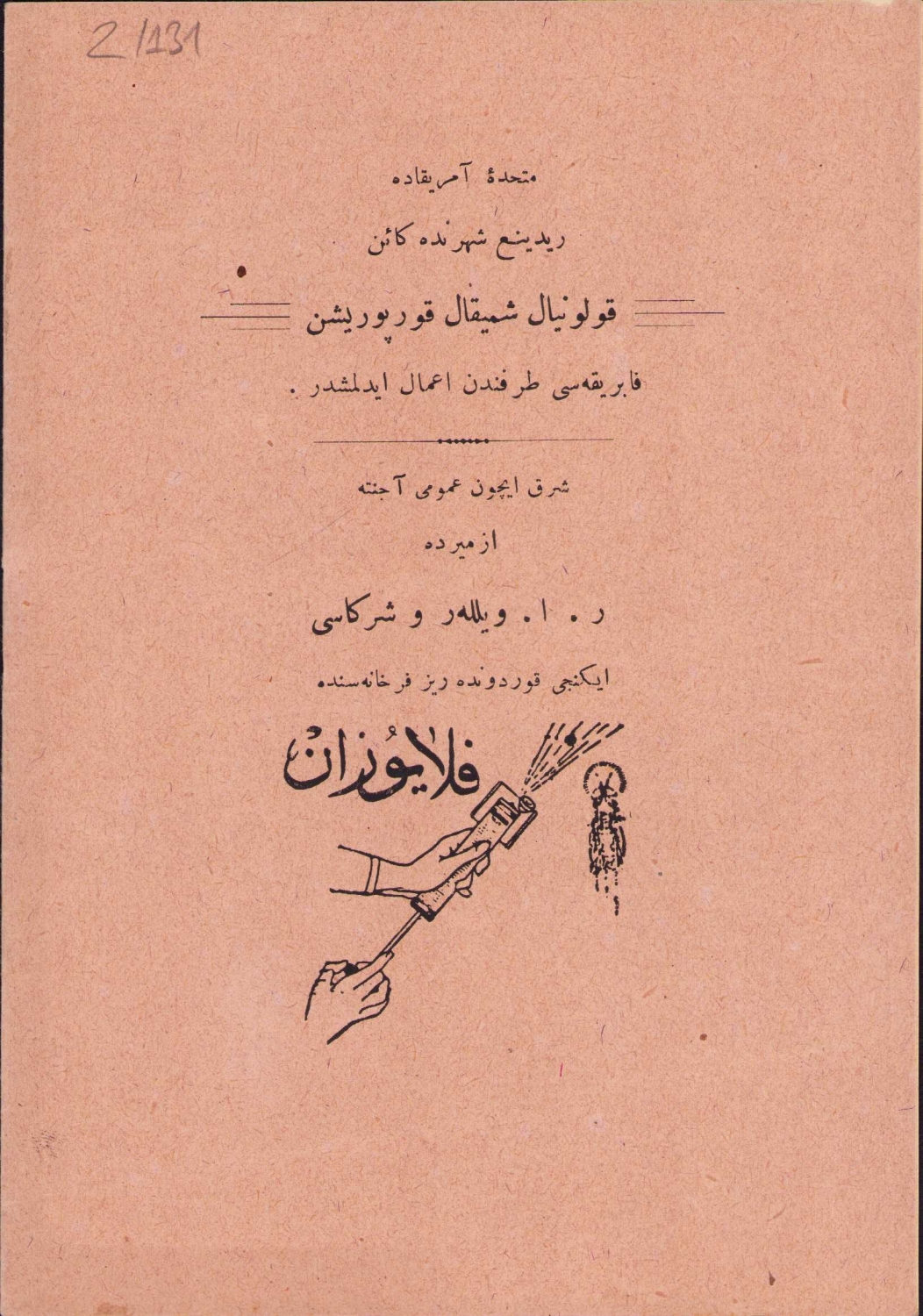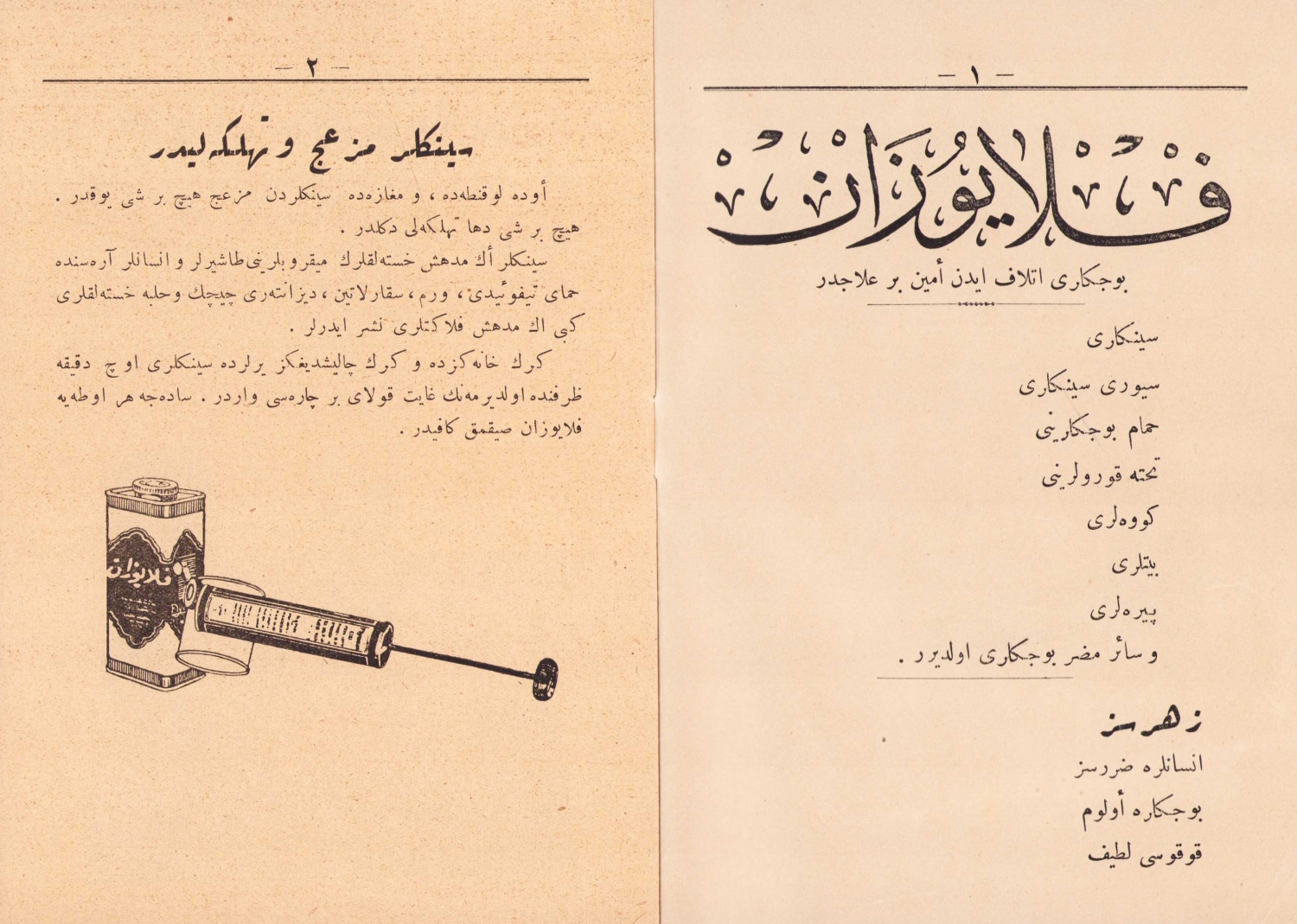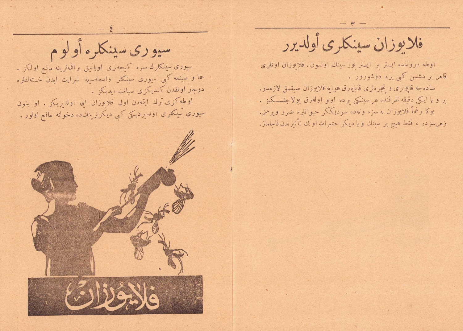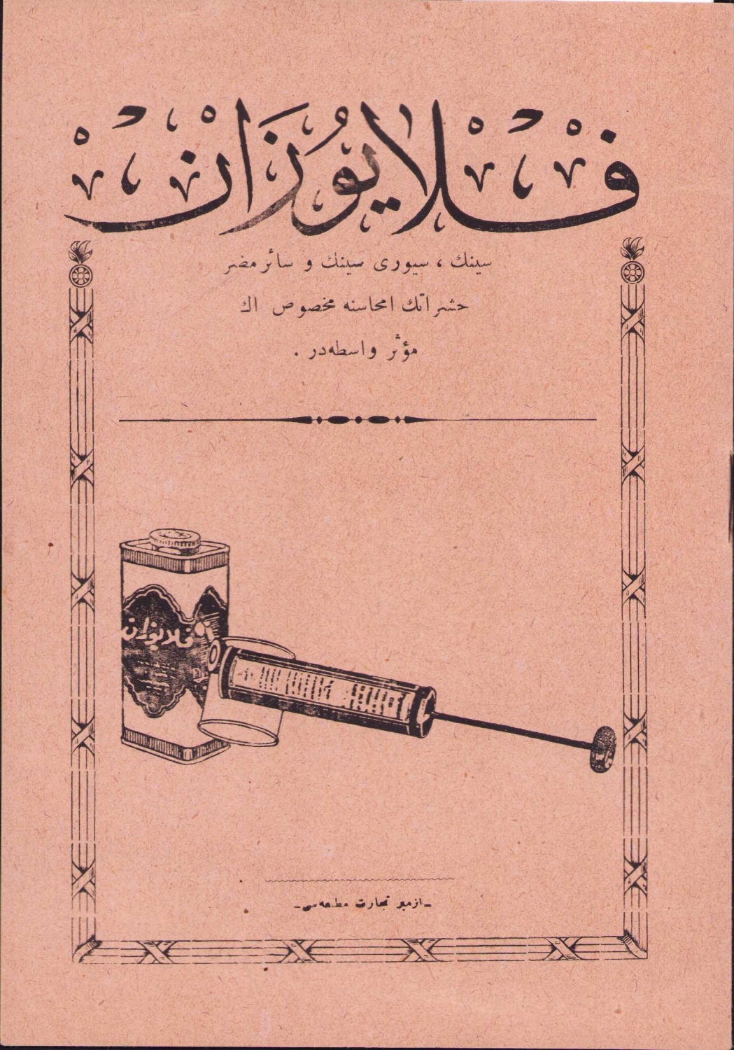 Flayozan Sinek, Sivri Sinek Vesair Muzır Haşerat için ilaç tanıtım broşürü, Şark İçin Umumi Acenta İzmir'de, İzmir Ticaret Matbaası, 10 sayfa, Osmanlıca, 14x20 cm.