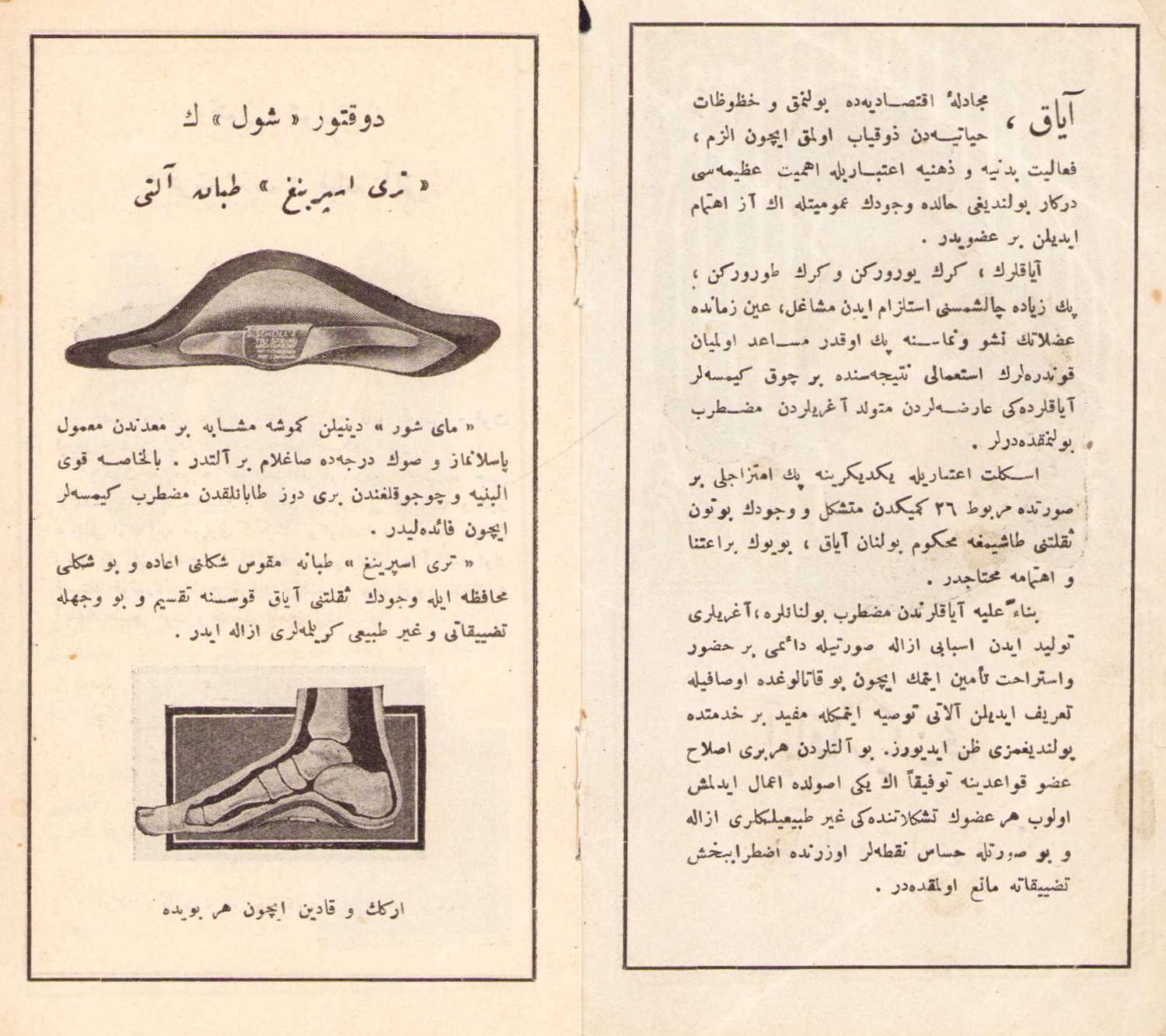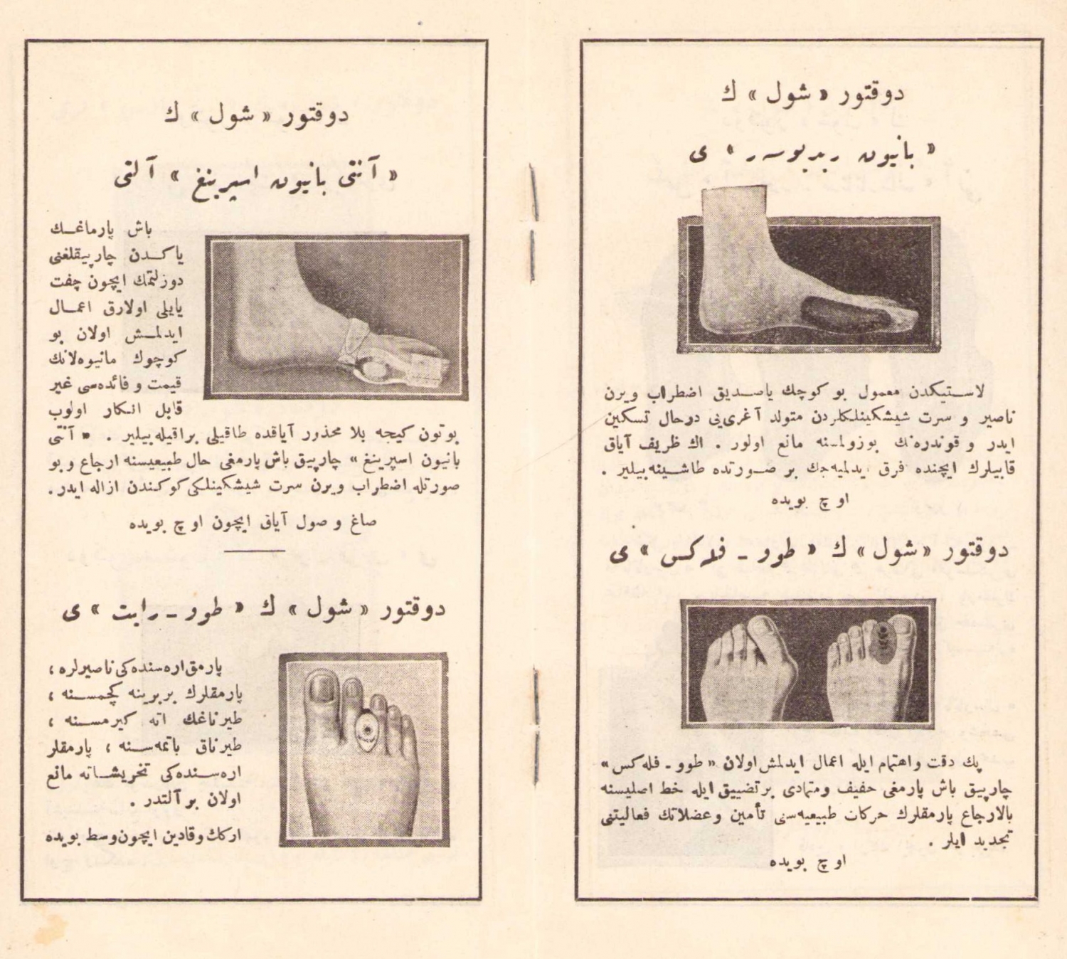 Doktor Şol'a [Scholl]'a ait ayak bakım malzemeleri reklam kitapçığı, Kağıdçılık ve Matbaacılık Anonim Şirketi, 12 sayfa, Osmanlıca, 8x15 cm.
