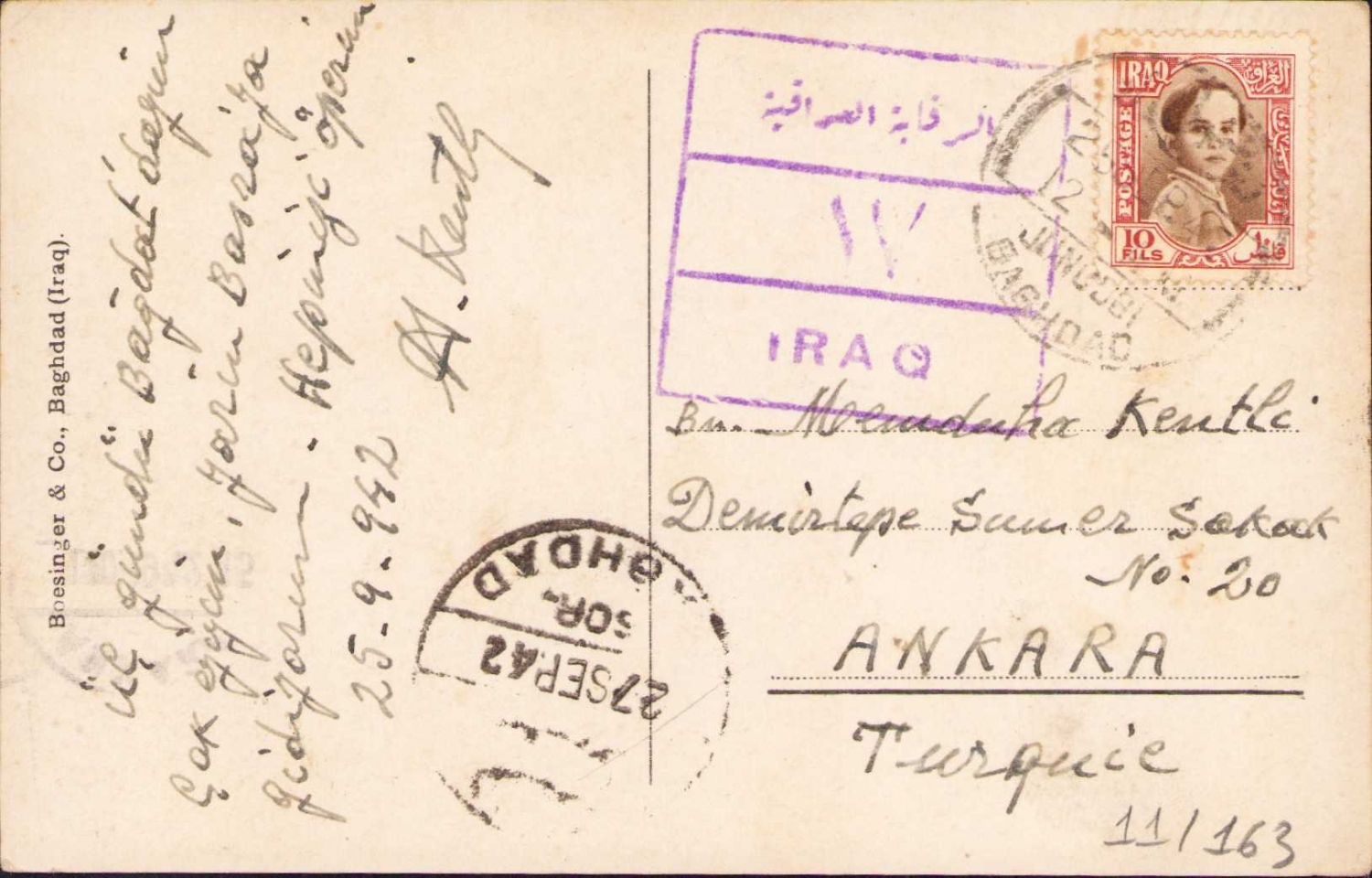 Kutü'l Amare, Boesinger & Co, Baghdad, Bağdad ve Irak damgalı, Bağdad'dan Ankara'ya gönderilmiş, postadan geçmiş.