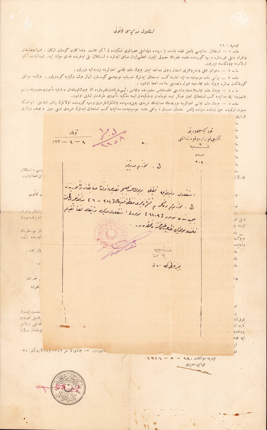 Mustafa Kemal Atatürk ıslak imzalı beyaz kurdele İstiklal Madalyası Vesikası, 1926 tarihli, Hıfzı Efendi bin Mehmed'e ait, 6109 numaralı, 23x37,5 cm.