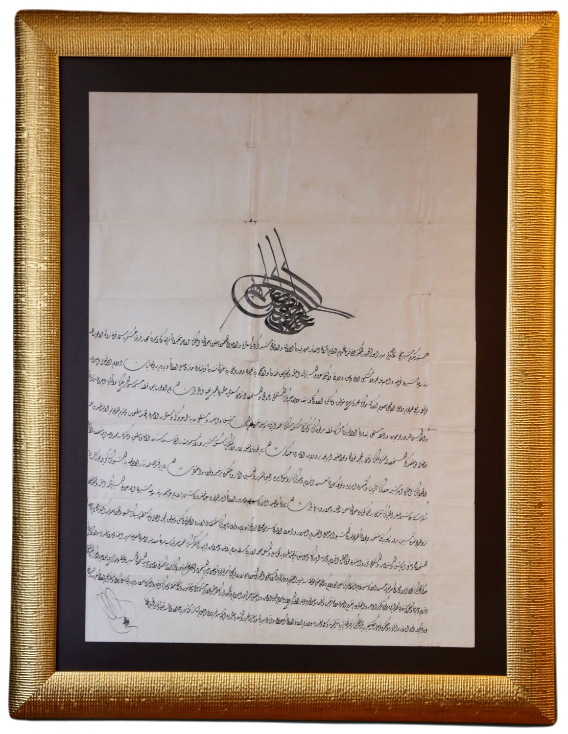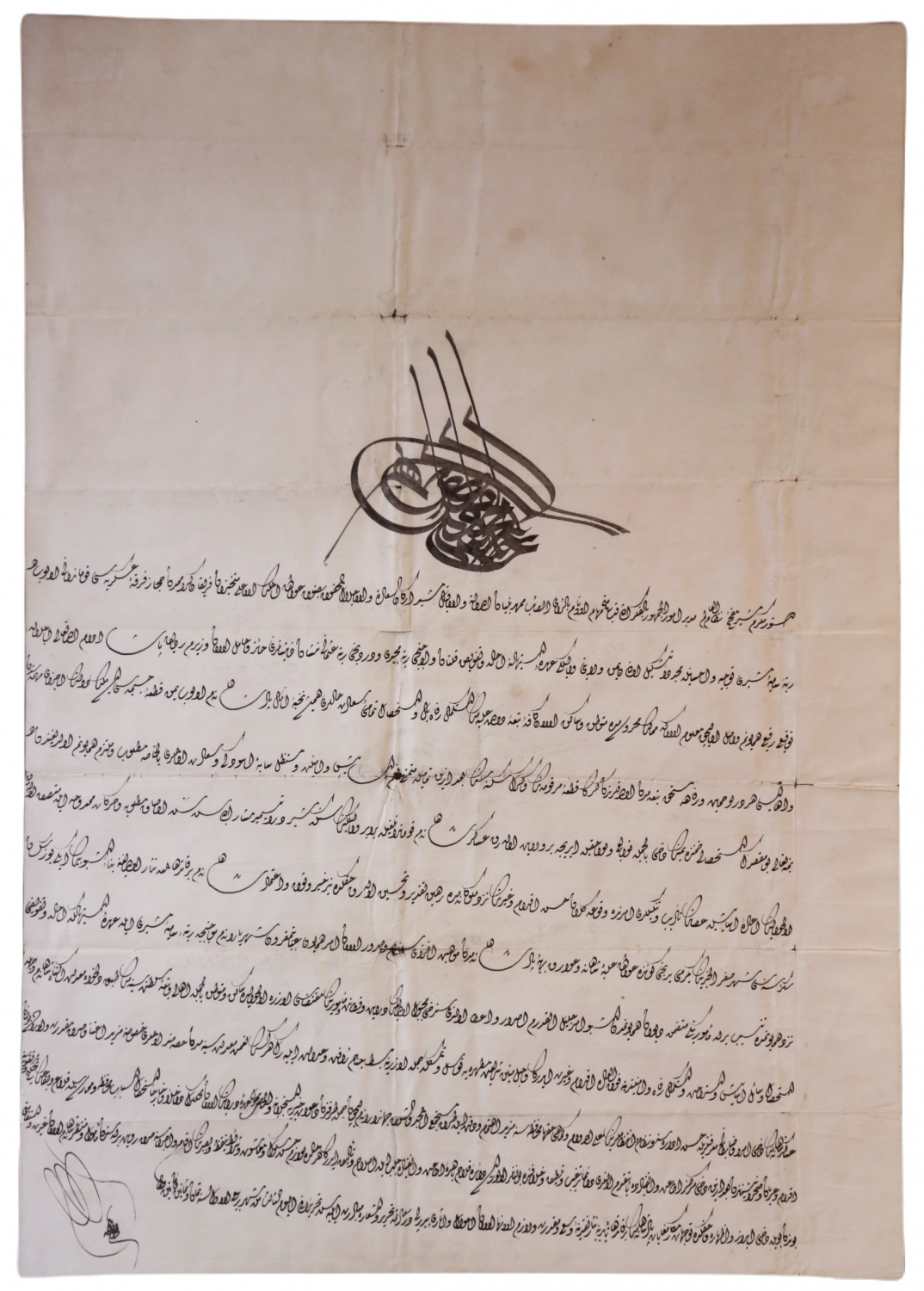 Hicaz Fırka-i Askeriyesi Kımandanı ve Yemen Valisi Redif Paşa'ya Yemen vilayetindeki halkın refahının sağlanması gerektiğine dair ferman, 1288 tarihli, Sultan Abdülaziz tuğralı, 56,5x80 cm.