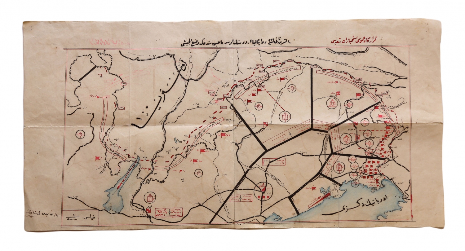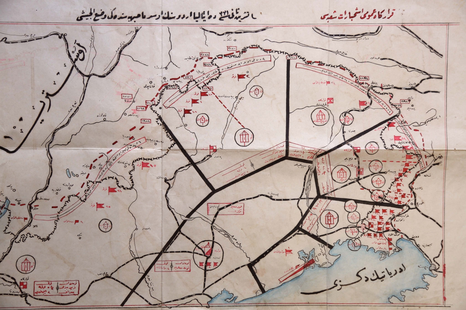 El Çizimi Birinci Dünya Savaşı İtalya Ordusu'nun Avusturya Cebhesi'ndeki Vaz'ülceyşi [Ordu Düzeni] Haritası, Karargah-ı Umumiye İstihbarat Şubesi, Mikyası:1/500.000, 1 Teşrin-i Sani 1331 tarihli, Osmanlıca, 58x30 cm.