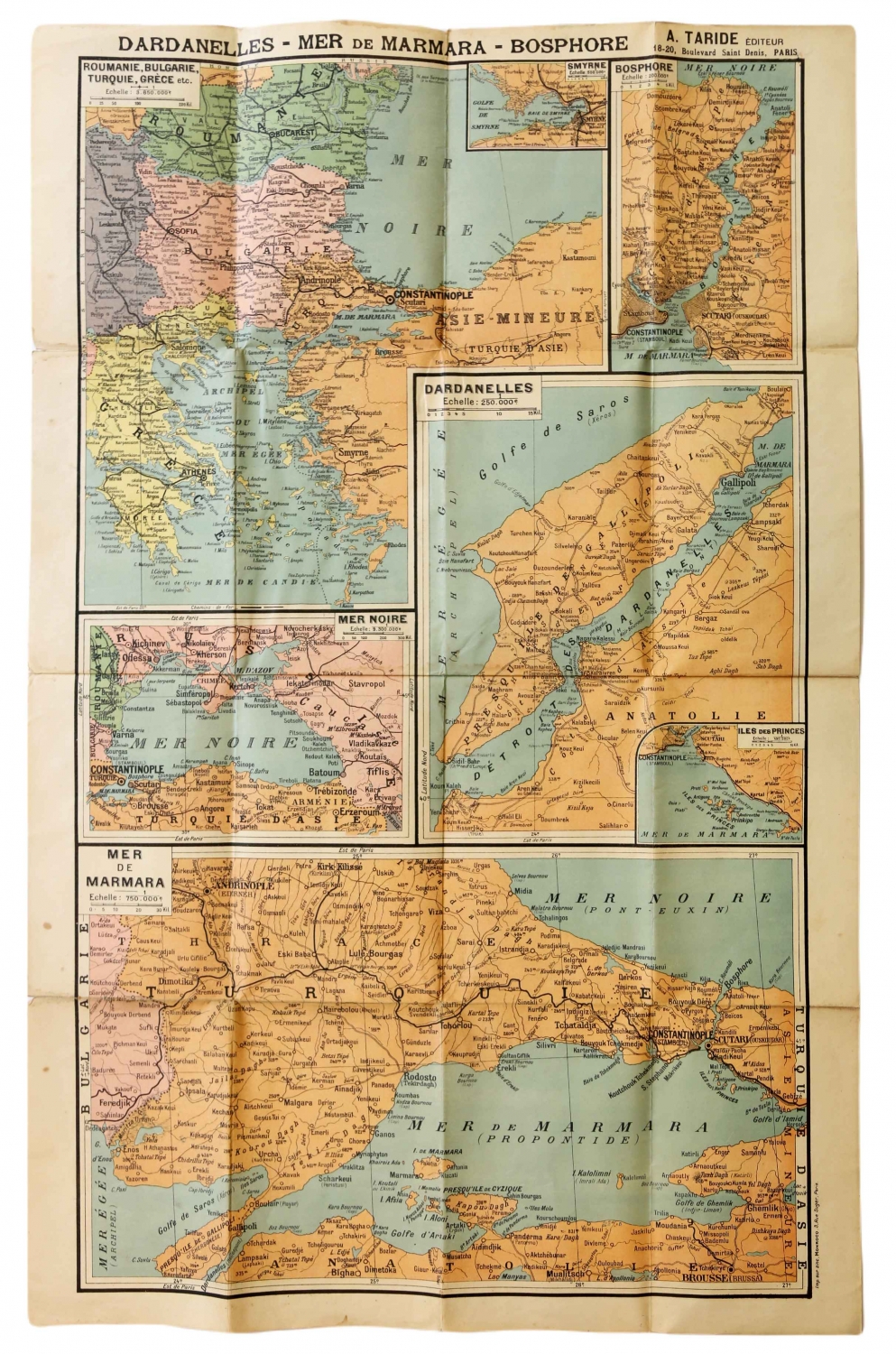 Çanakkale Boğazı, İstanbul Boğazı ve Marmara Denizi, Adalar, İzmir ve Karadeniz Haritası, Editör: A. Taride, Paris, Fransızca, orijinal kabında, 46x71,5 cm.