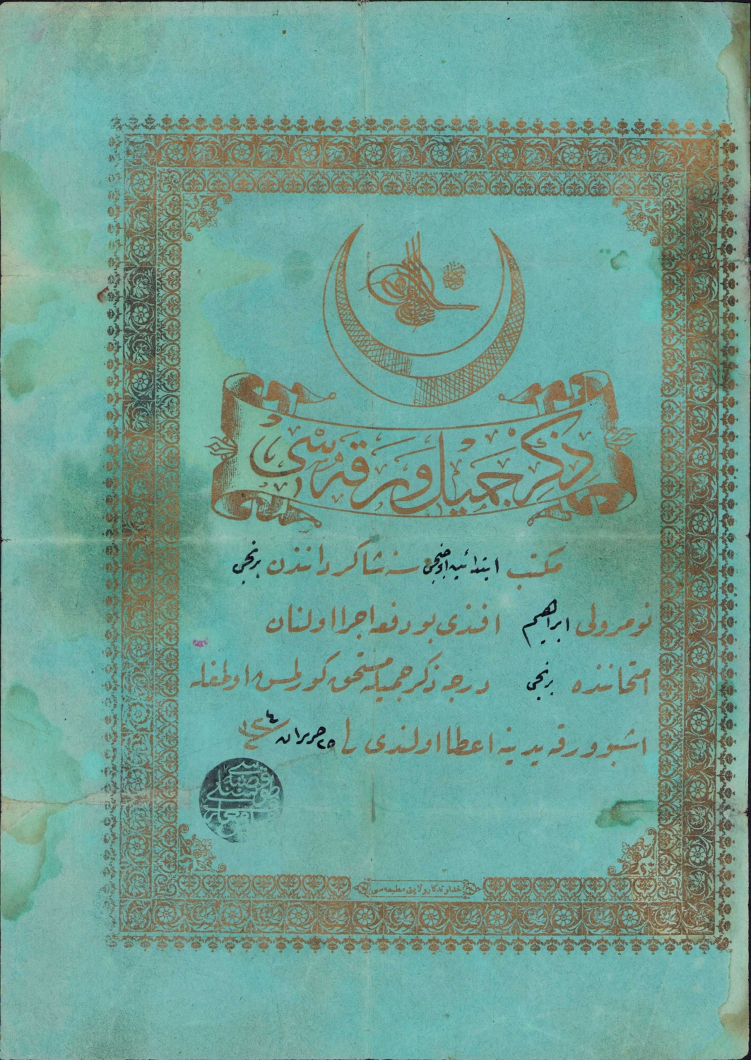 Birinci Derece Denizcilik Varakası, Mekteb-i İbtidaiye üçüncü sınıf öğrencisi İbrahim'e ait, 1324 tarihli, Osmanlıca, 20,5x28,5 cm.