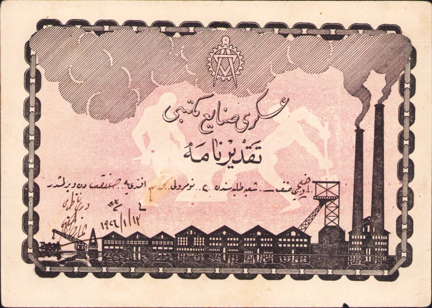 Askeri Sanayi Mektebi Takdirnamesi, üçüncü sınıf talebesine ait, 1926 tarihli, 16x12 cm.