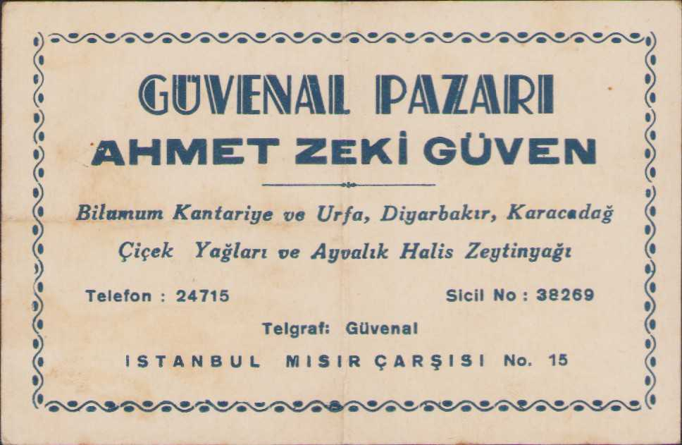 Güvenal Pazarı İş yeri Kartı, Ahmet Zeki Güven'e ait İstanbul Mısır Çarşısı'ndaki Ayvalık zeytinyağı