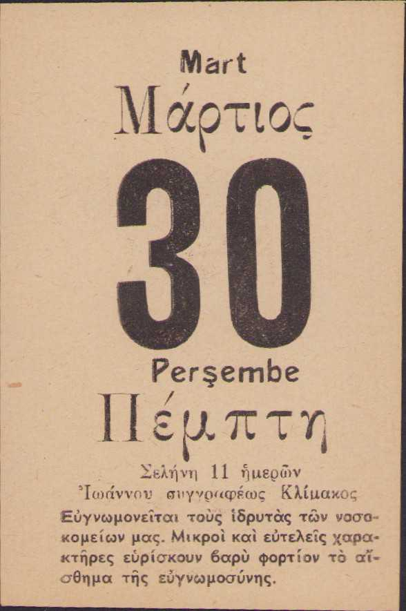 Takvim Yaprağı, 30 Mart tarihli, Türkçe ve Rumca iki dilli, 7,5x11,5