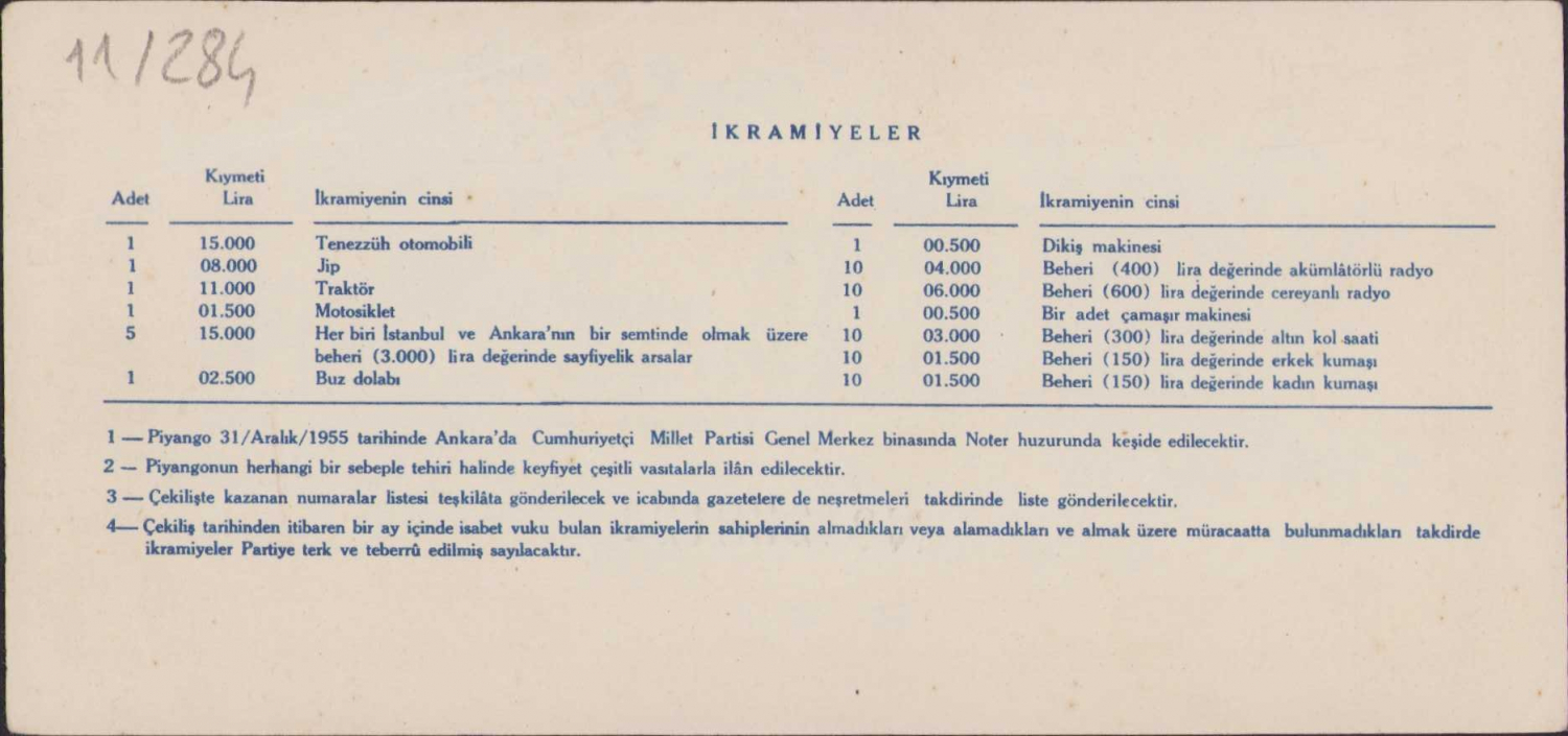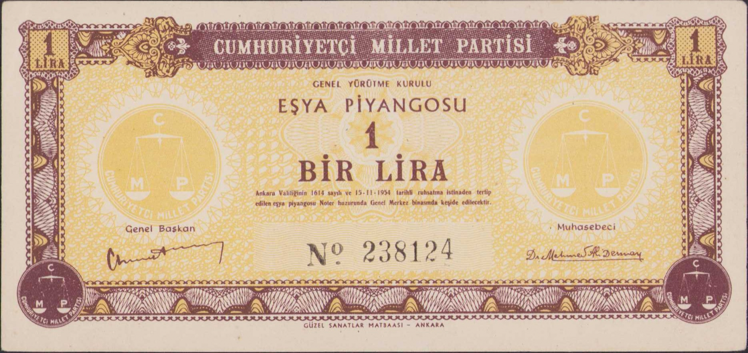 Cumhuriyetçi Millet Partisi Eşya Piyangosu 1 Lira, 1954 tarihli, Güzel Sanatlar Matbaası-Ankara baskı