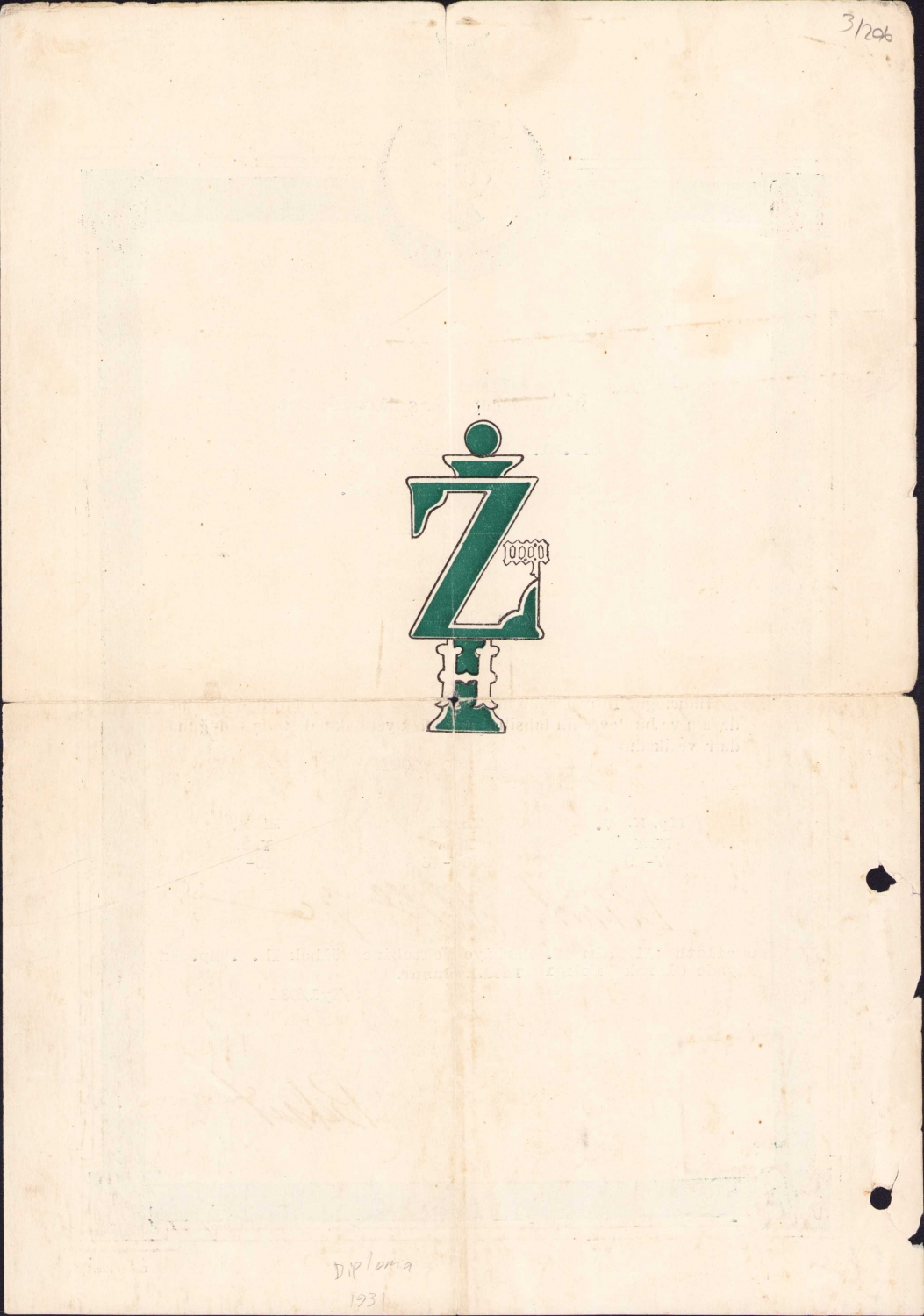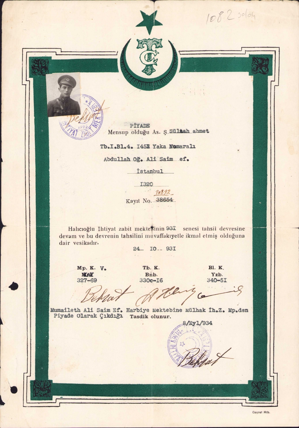 İhtiyat ve Zabit Mektebi'nden Harbiye Mektebine piyade olarak çıktığına dair diploma, 1934, kenarları yırtık, 21x31 cm