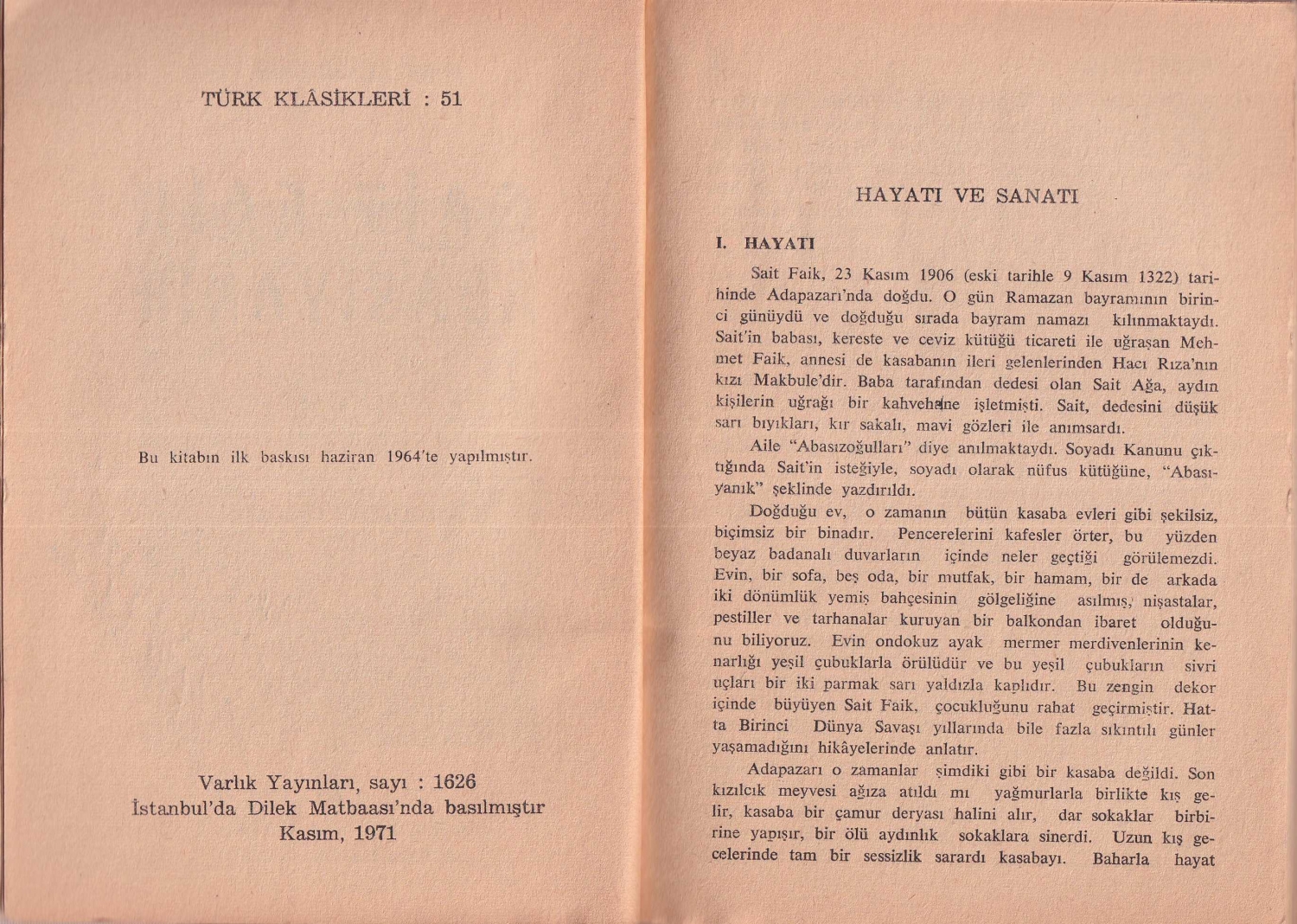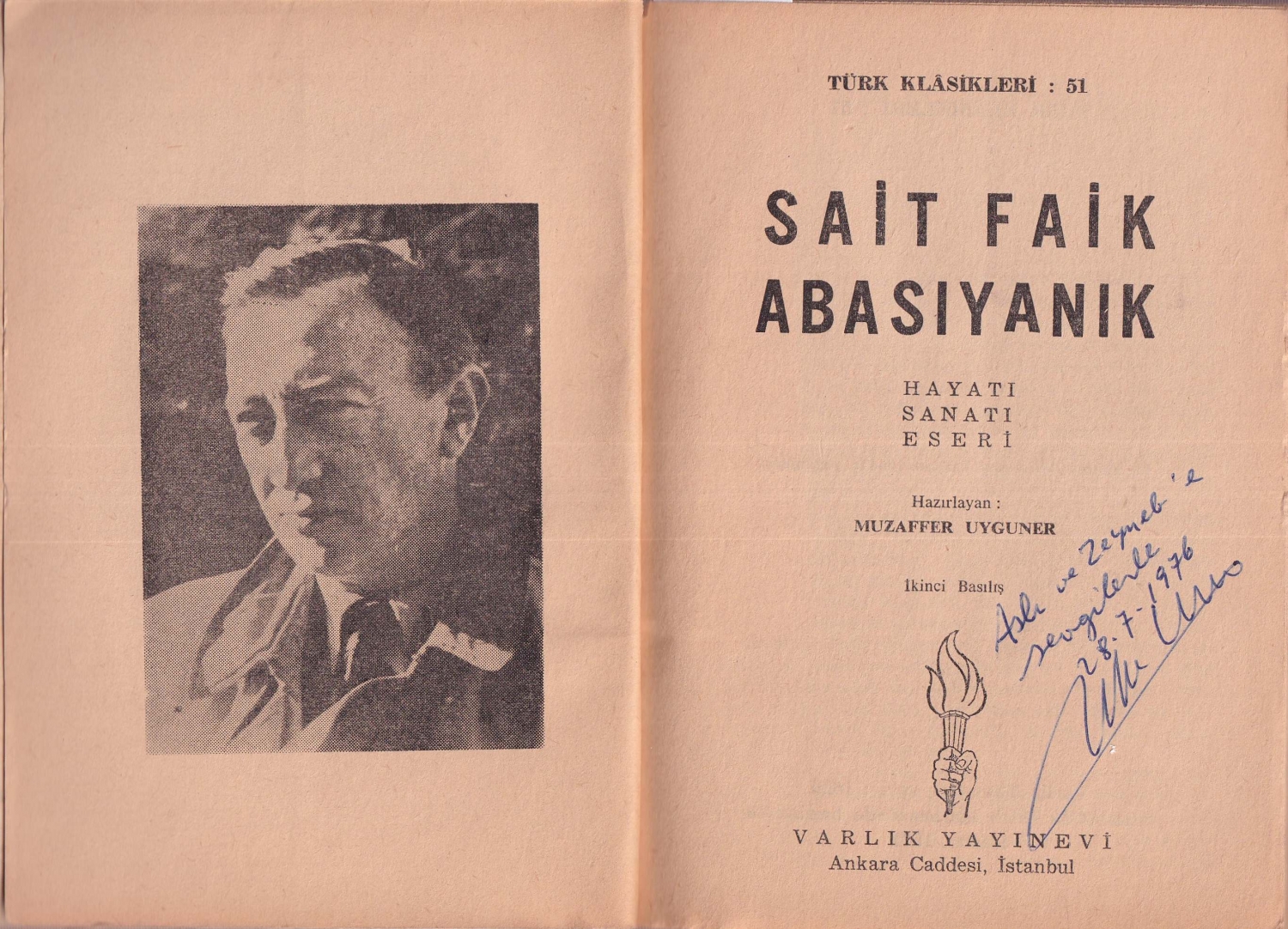 Sait Faik Abasıyanık, Hayatı Sanatı ve Eserleri, Hazırlayan: Muzaffer Uyguner, Varlık Yayınları, imzalı, İstanbul, 1971, 12x16,5 cm.