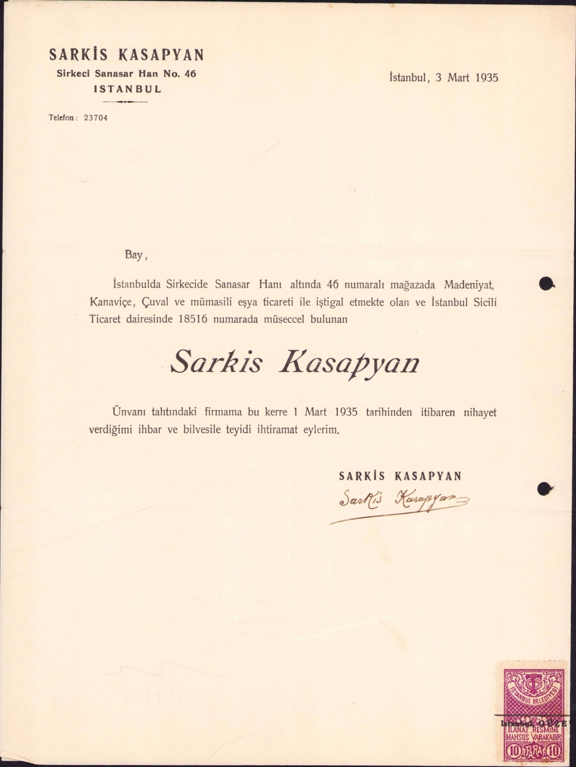 Sarkis Kasapyan ve Mahdumu Nalburiye ve Madeniyat antetli evrak, 21x28 cm