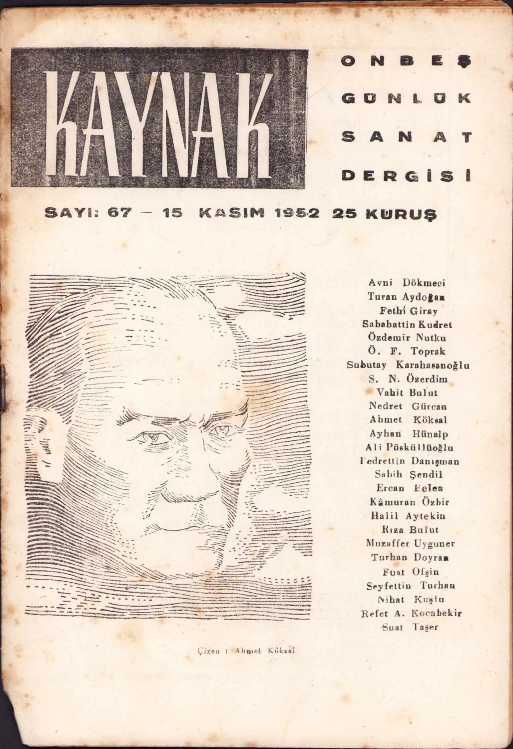 Kaynak - sanat dergisi, 1952, çizen Ahmet Köksal, Atatürk kapak, 27 sayfa, 13x19 cm