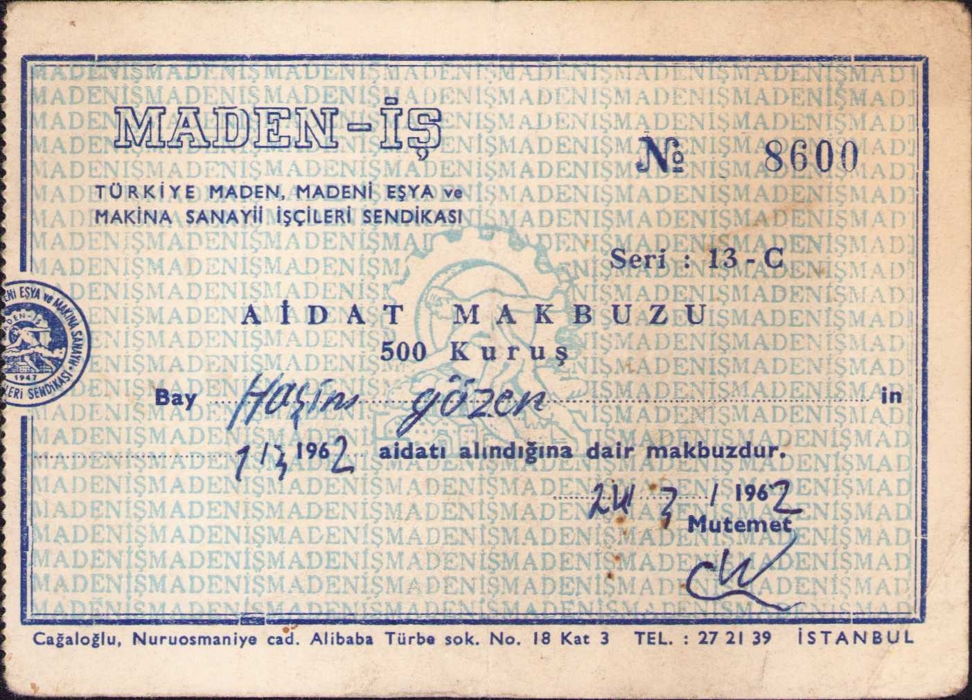 Maden - İş antetli aidat makbuzu, 1962, 10x7 cm