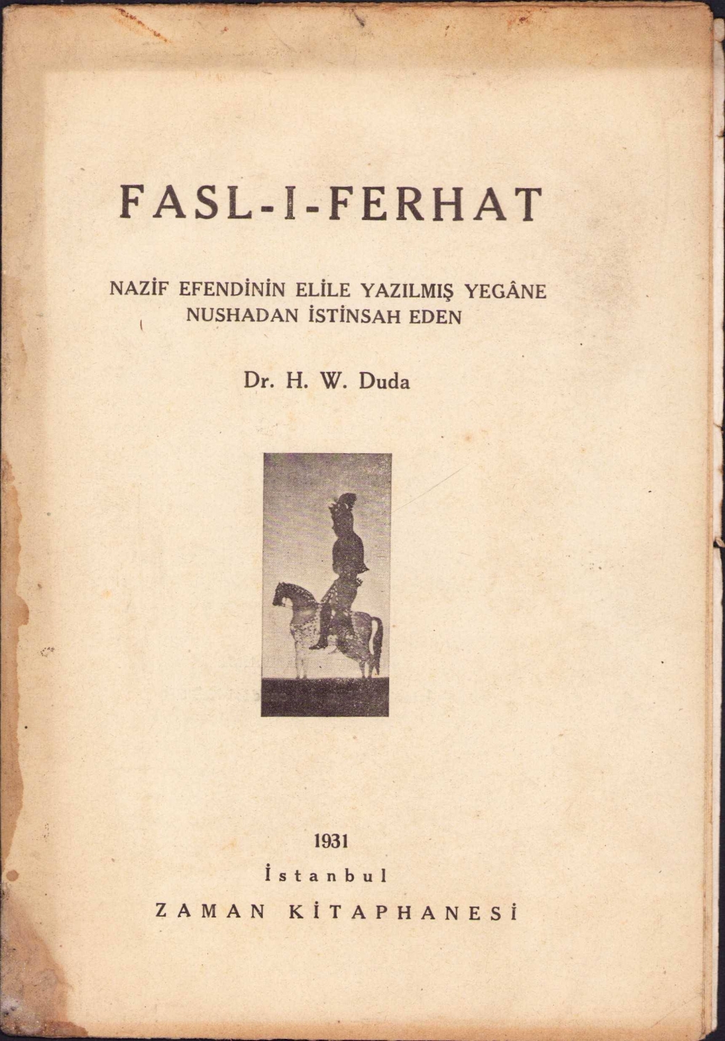 Fasl-ı Ferhat - Nazif Efendi'nin el ile yazılmış yegane nüshadan istinsah eden Dr. H. W. Duda, İstanbul, 1931, 16 sayfa, 13x19 cm