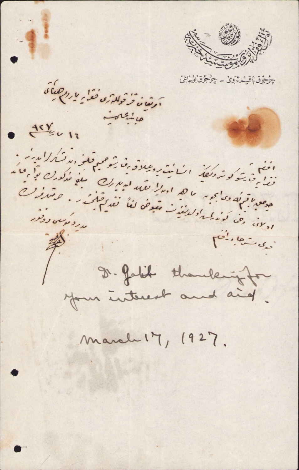 Osmanlıca Türk Fukaraperver Müesesesi Hayriyesi antetli, 1927, 13x22 cm