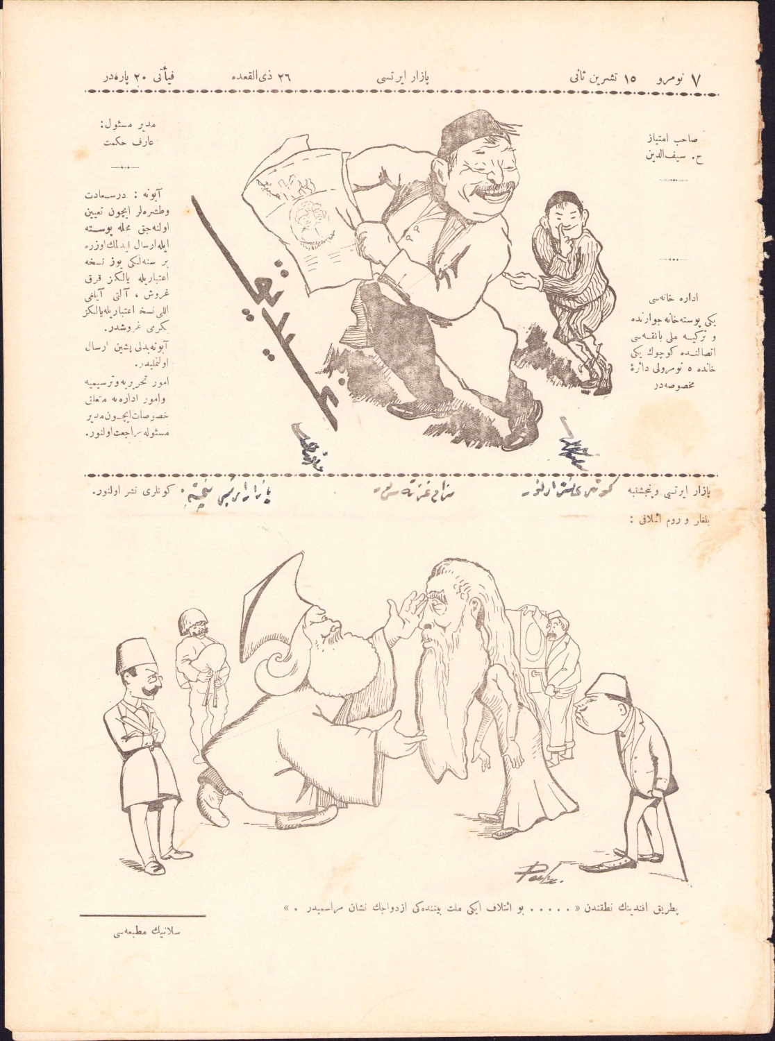 Osmanlıca Gıdık mizah gazetesi, Selanik Matbaası, sahibi H. Seyfettin, kapak "Patrik Efendinin Nutkundan.... Bu İtilaf İki Millet Beynindeki İzdivacın Nişan Merasimidir", resimli, 8 sayfa, 23x32 cm