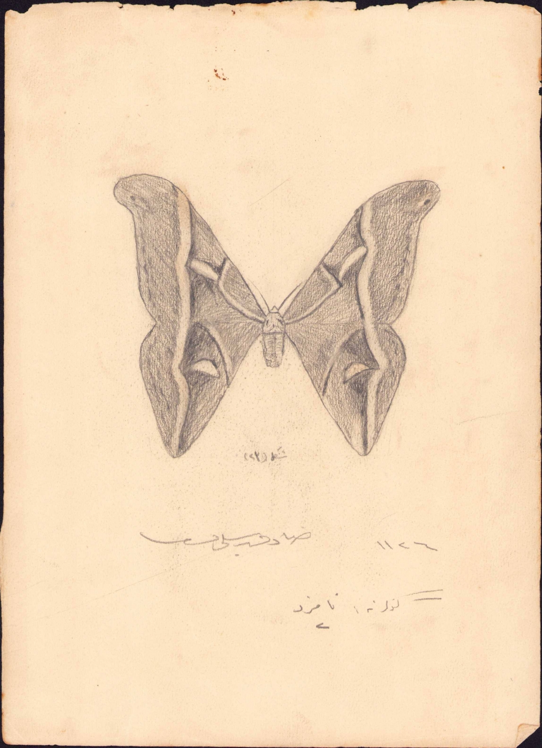 Osmanlıca 'Sadık Süleyman' imzalı, kurşun kalem kelebek çizimi, 18,5x26,5 cm.