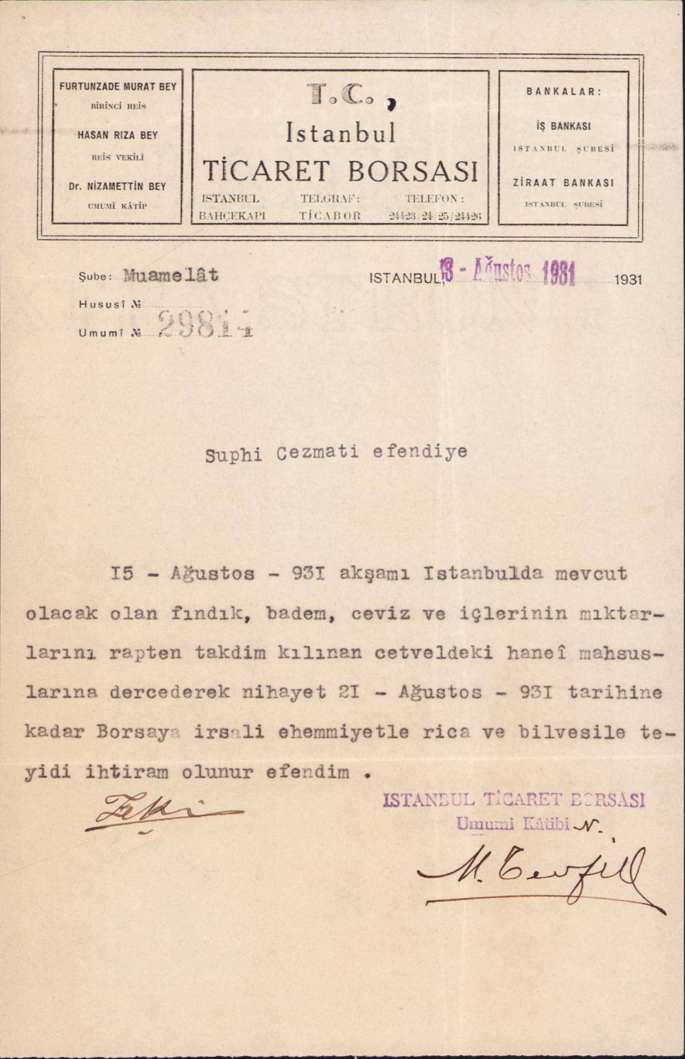 İstanbul Ticaret Borsası antetli, Suphi Cezmati Efendi'ye imzalı, İstanbul Ticaret Borsası Umumi Katibi M. Tevfil imzalı belge, İstanbul'da mevcut olacak fındık, badem ve ceviz piyasası ile ilgili, 1931 tarihli, 15x22,5 cm.