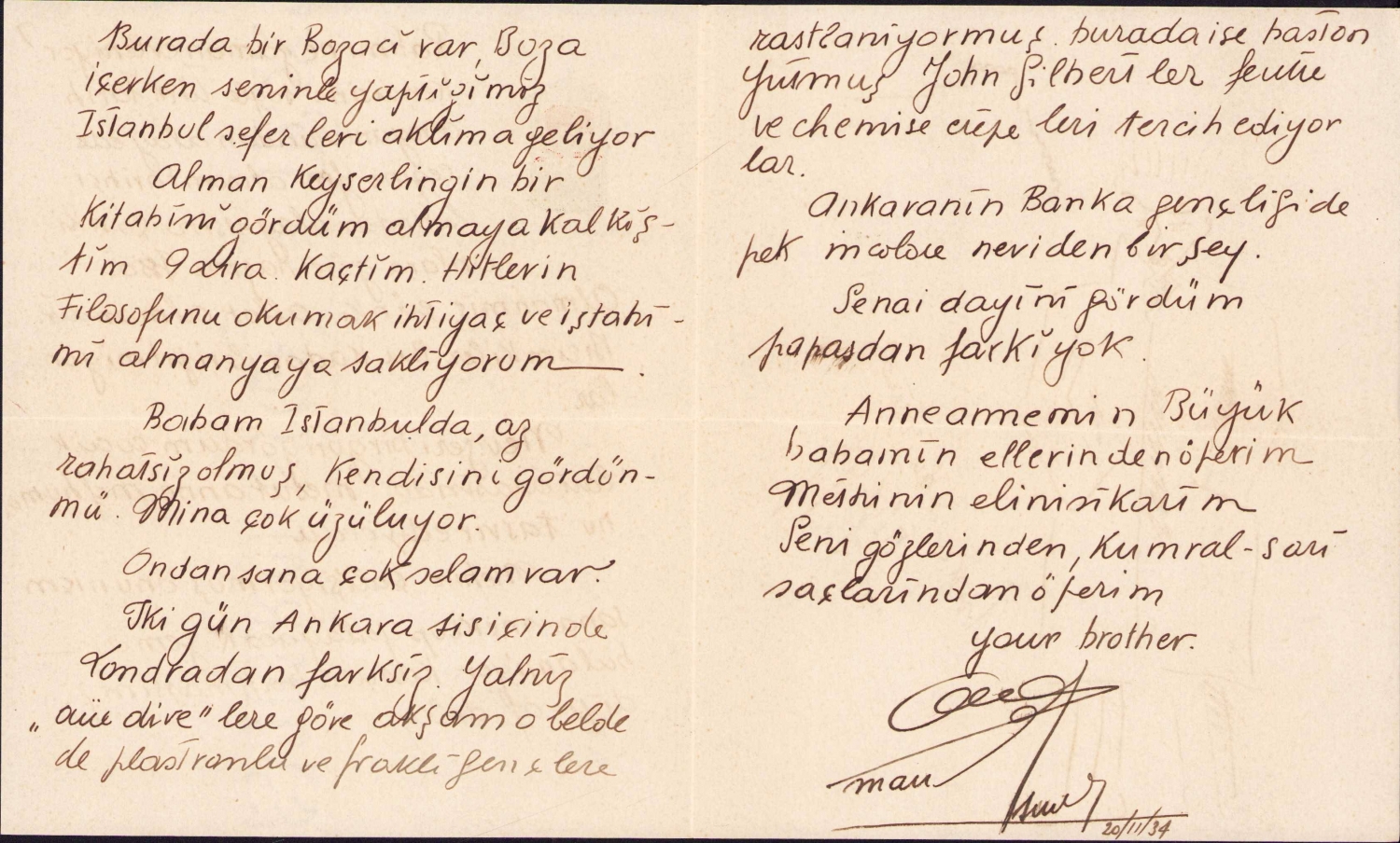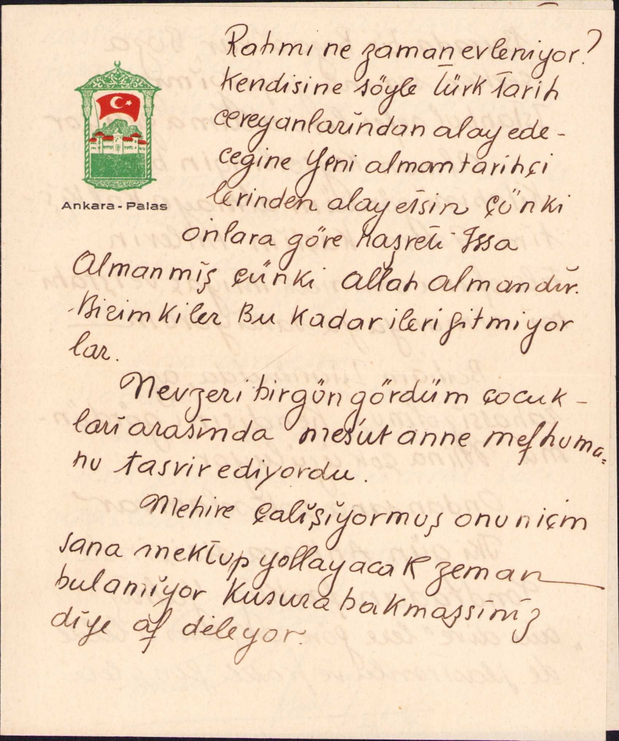 Ankara Palas antetli, 1934 tarihli mektup, 4 sayfa, arkası çizimli, imzalı, 14x17 cm.