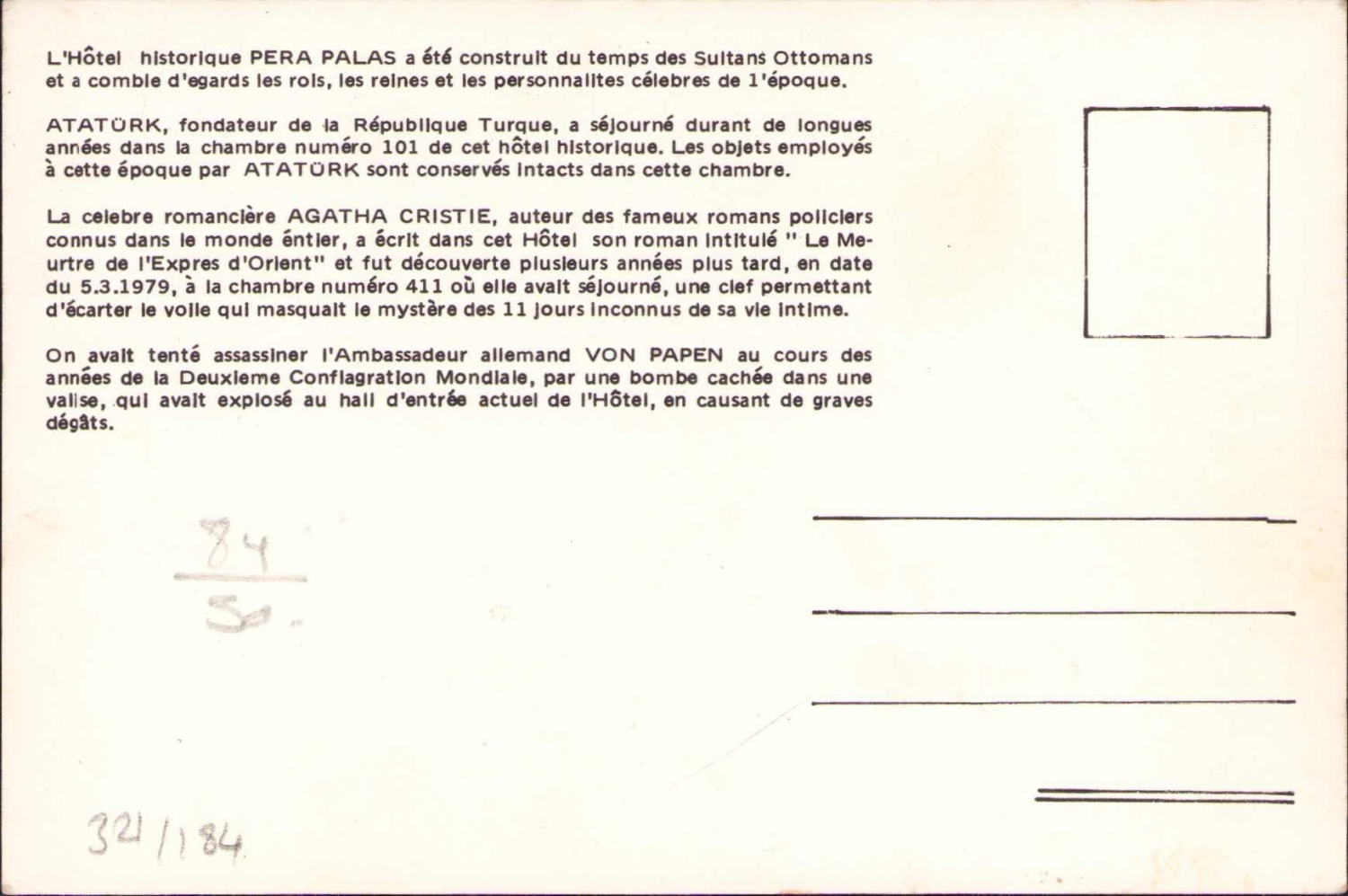 Hotel Pera Palas kartpostal, İstanbul, Fransızca.