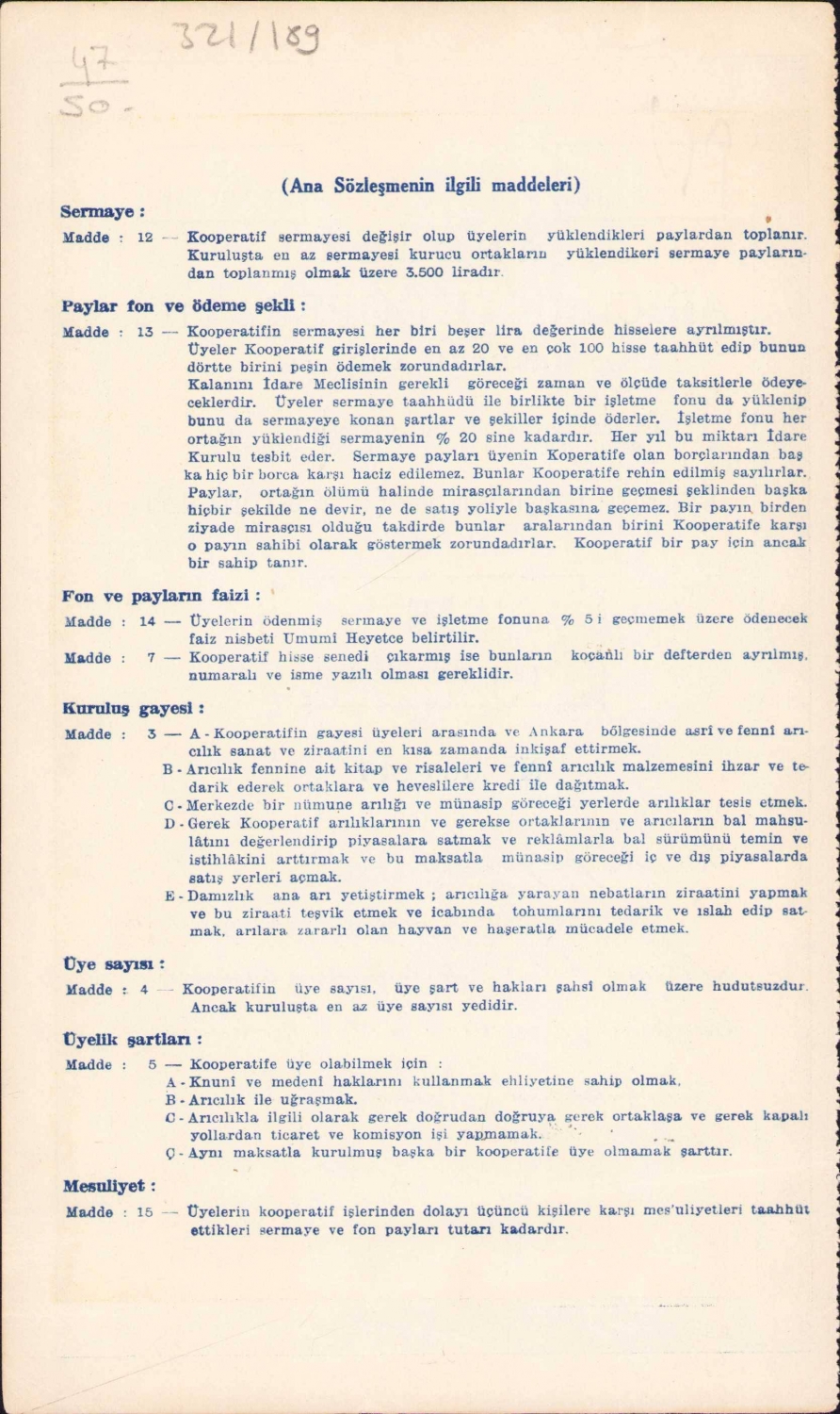Ankara Arıcılık Kooperatifi Hisse Senedi, Beş Türk Lirası, İdare Meclisi Reisi imzalı, 14x24 cm.