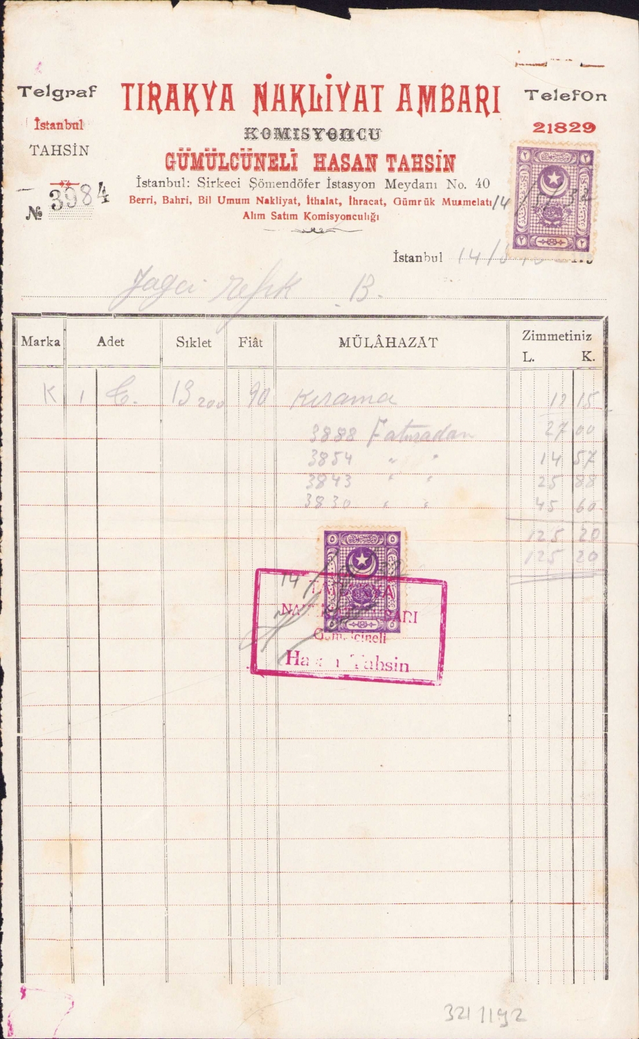 Trakya Nakliyat Ambarı Komisyoncu Gümülcineli Hasan Tahsin antetli fatura, damgalı ve pullu, 1932 tarihli, 18x29,5 cm.