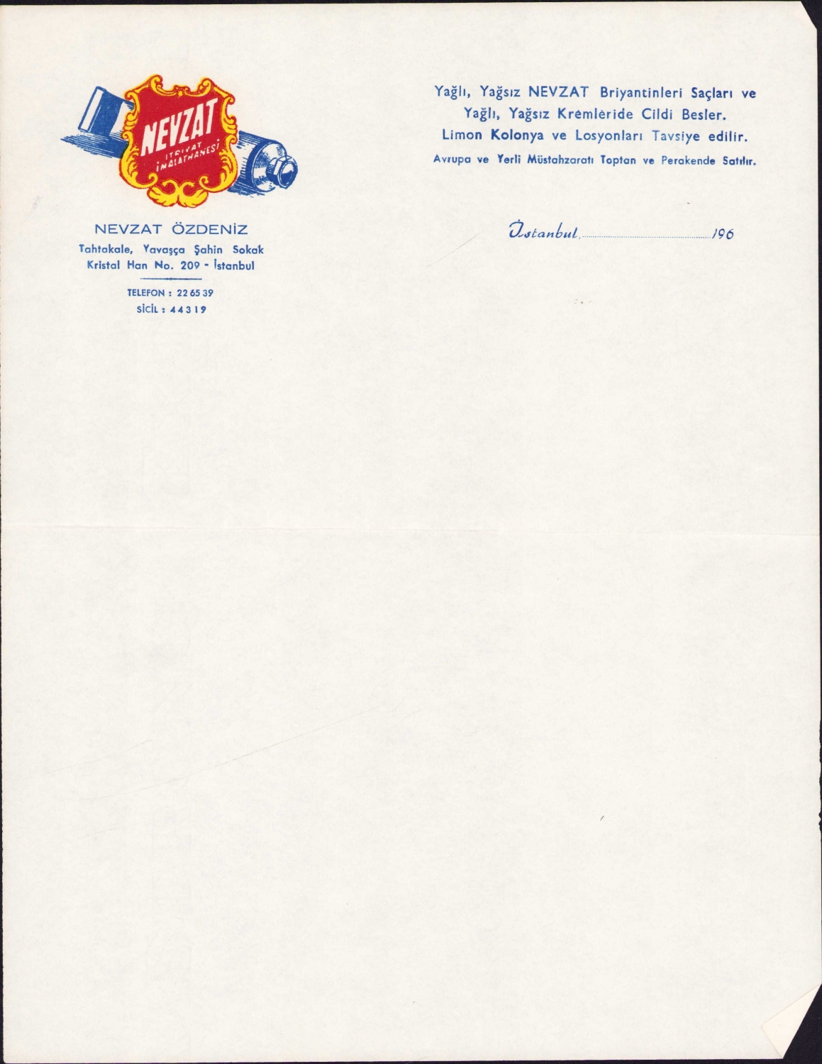 Nevzat Itriyat İmalathanesi antetli boş kağıt, 1960'lar, İstanbul, Yağlı Yağsız Nevzat Briyantinleri, 22,5x29 cm.