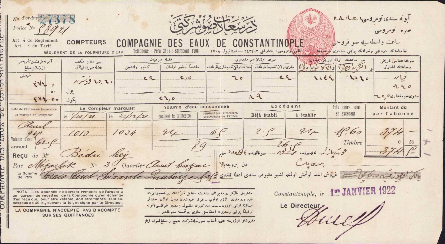 Dersaadet Su Şirketi Abone Senedi, 1922 tarihli, Osmanlıca ve Fransızca, 26,5x14 cm.