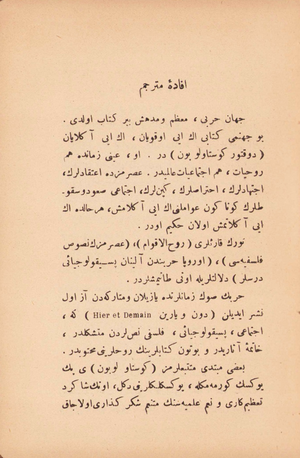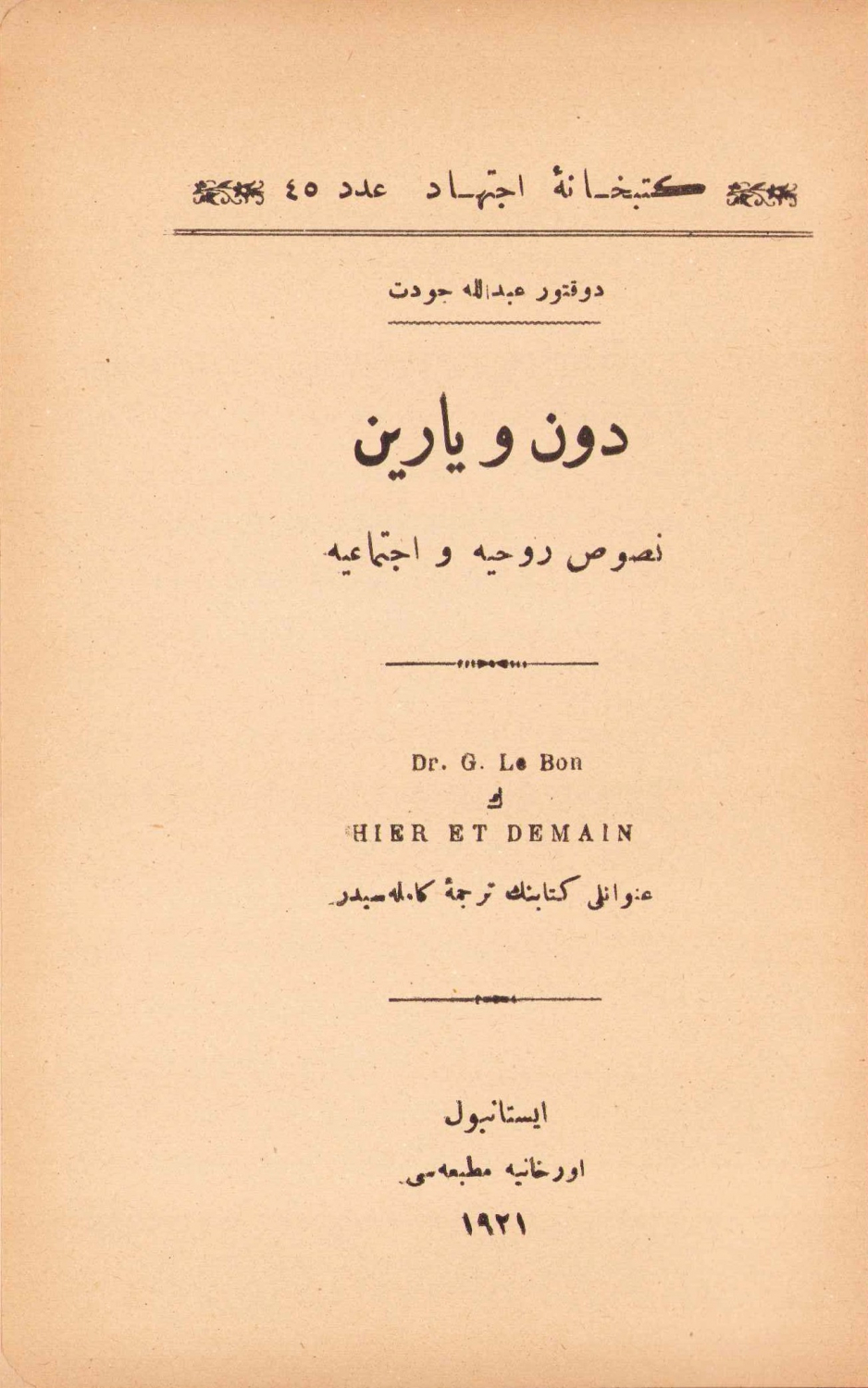Dün ve Yarın, Gustave Le Bon, İstanbul-Orhaniye Matbaası, 1921 tarihli Osmanlıca, 262 sayfa, 12x18cm