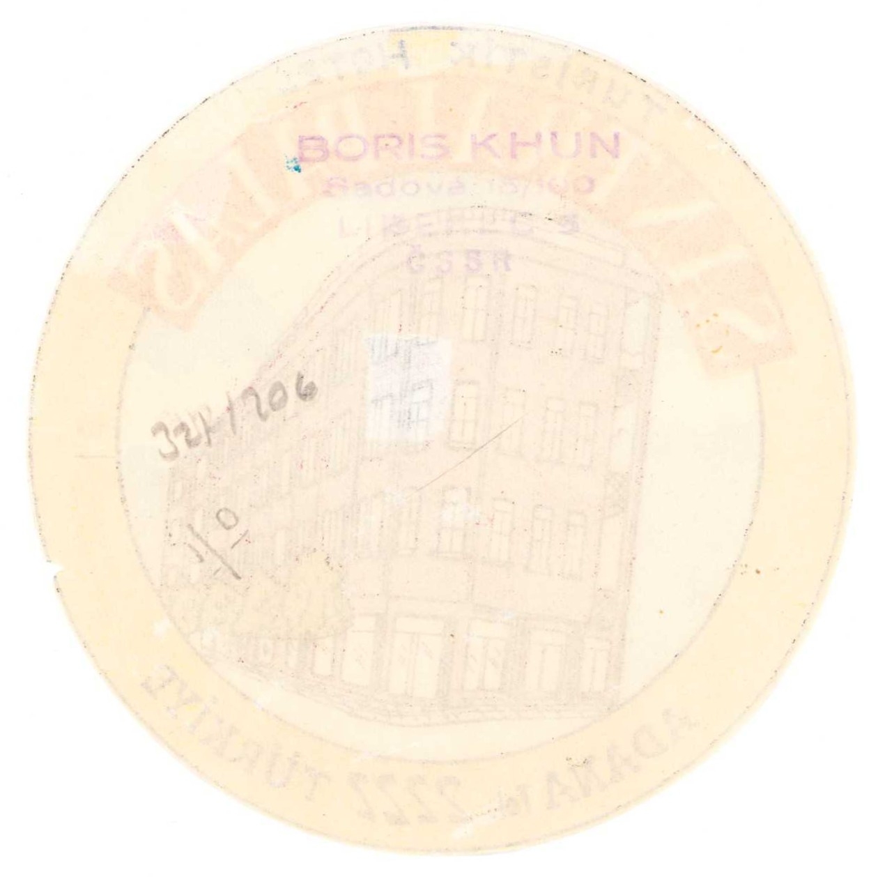 Turistik Hotel, Santral Palas Adana reklam etiketi, arkasında Boris Khun damgalı, 10 cm.
