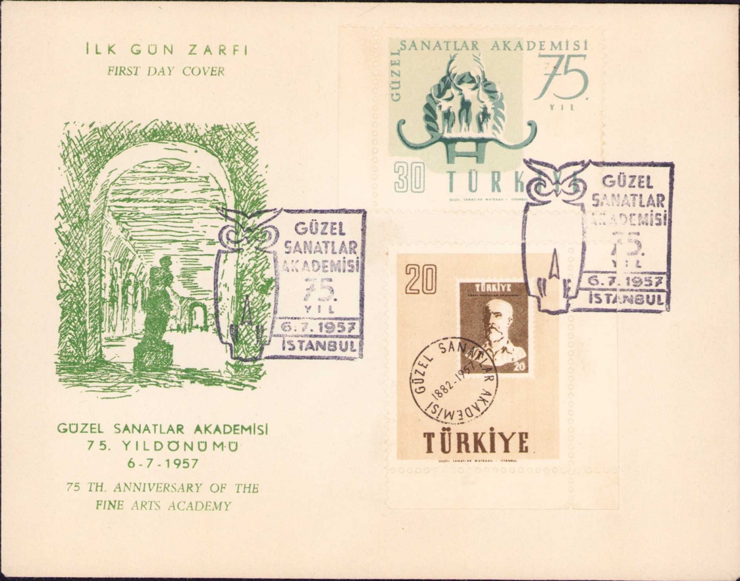 Güzel Sanatlar Akademisi 75. Yıl Dönümü İlk Gün Zarfı, 1975 tarihli, damgalı ve pullu, 15,5x12 cm.