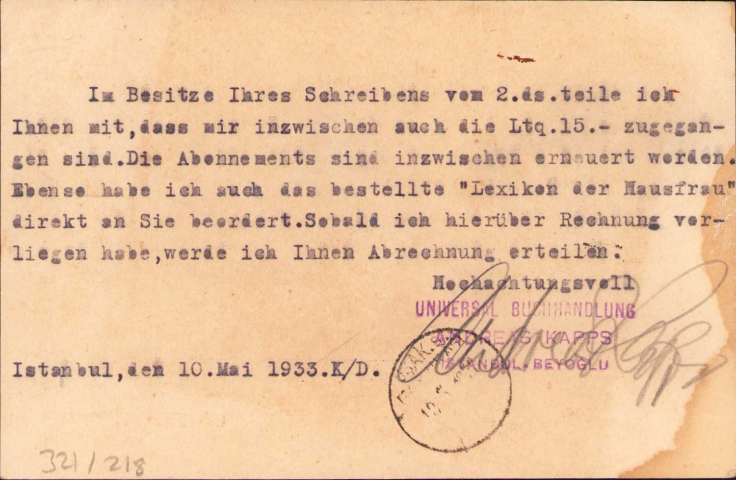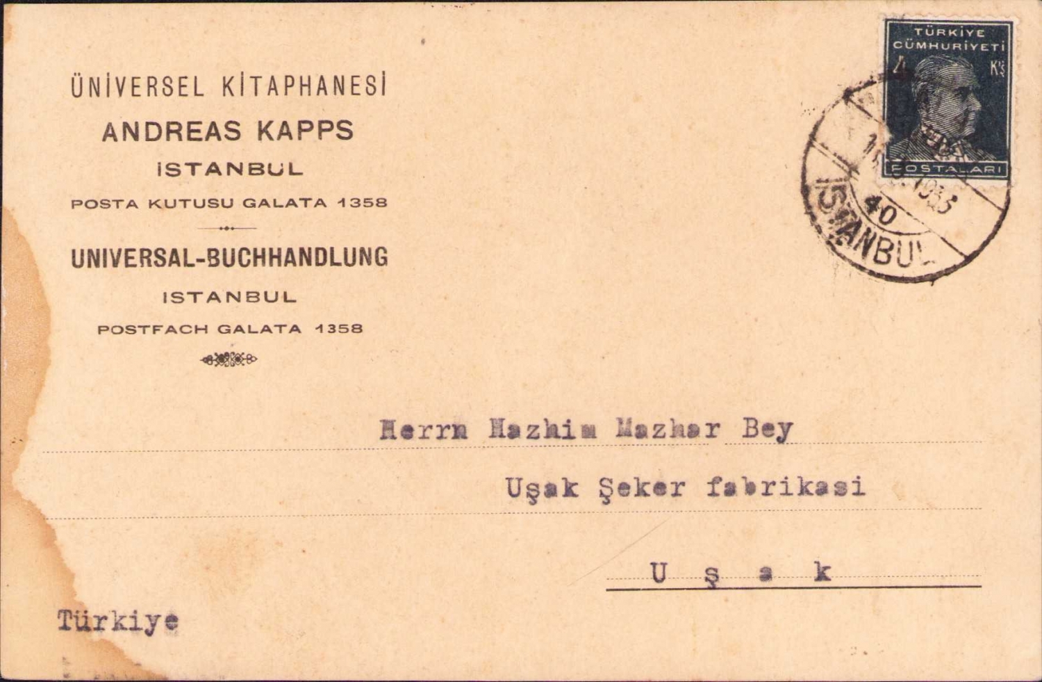Üniversal Kitaphanesi Andreas Kapps İstanbul antetli, Herrn Hazhim Mazhar Bey Uşak Şeker Fabrikası'na gönderilmiş Almanca mektup, damgalı ve pullu, 15x9 cm.