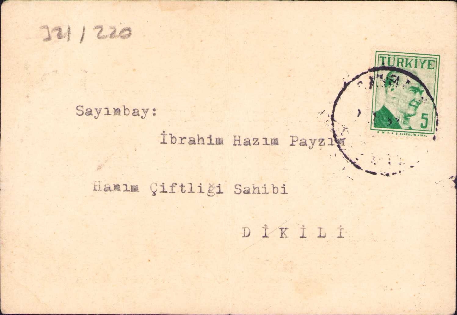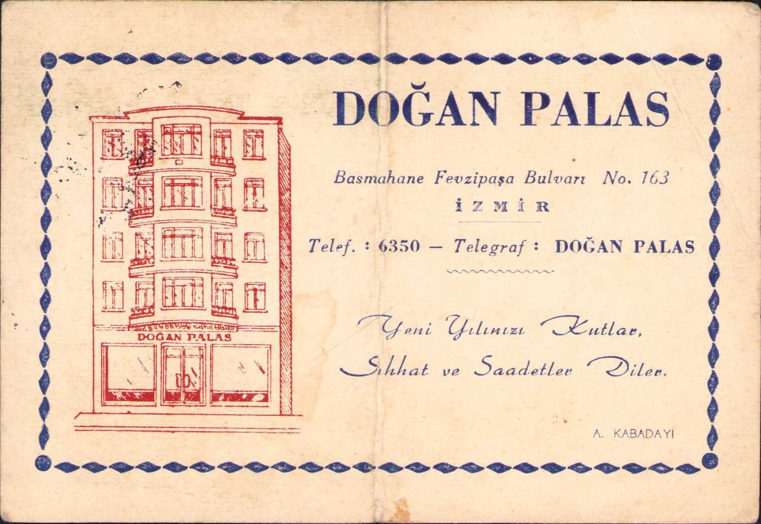 İzmir Doğan Palas reklamlı yeni yıl tebrik kartı, Bay İbrahim Hazım Payzın Hanım Çiftliği Sahibi, Dikili yazılı, damgalı ve pullu, haliyle, 12,5x9 cm.