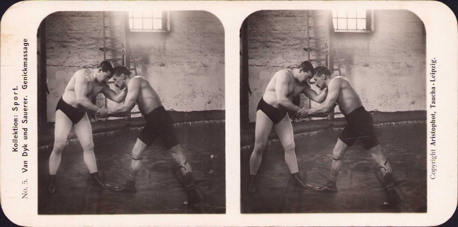 Stereoview fotoğraf, Güreşciler, Spor, Aristophot, Taucha-Leipzig, 18x9 cm