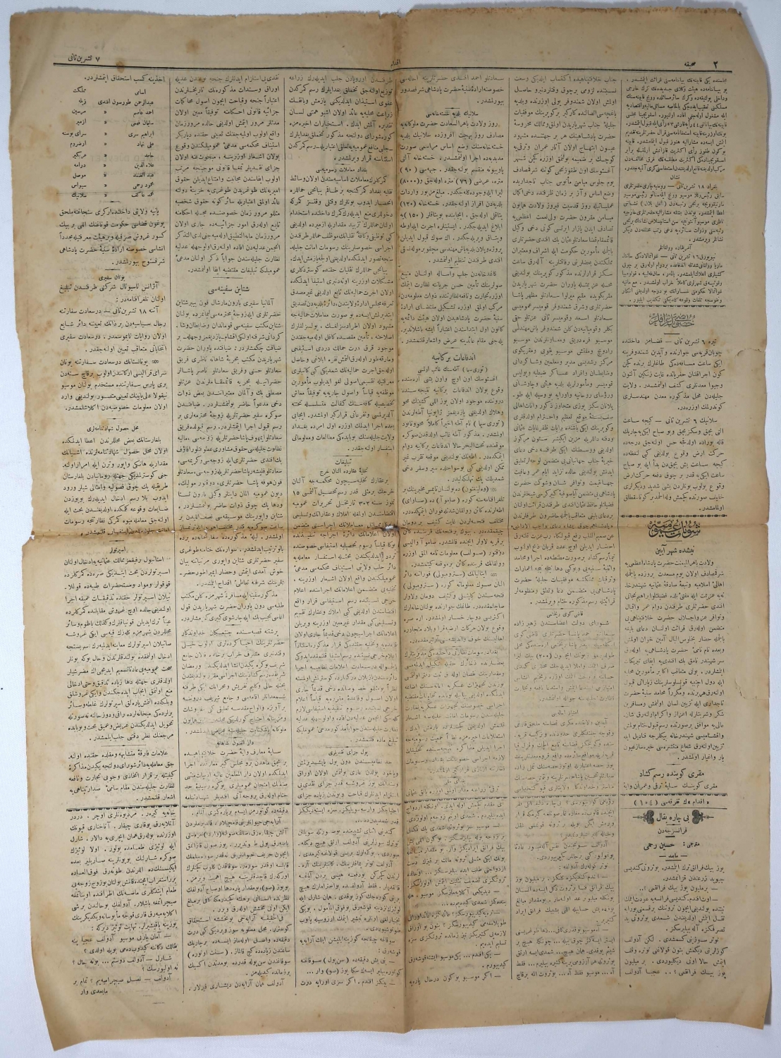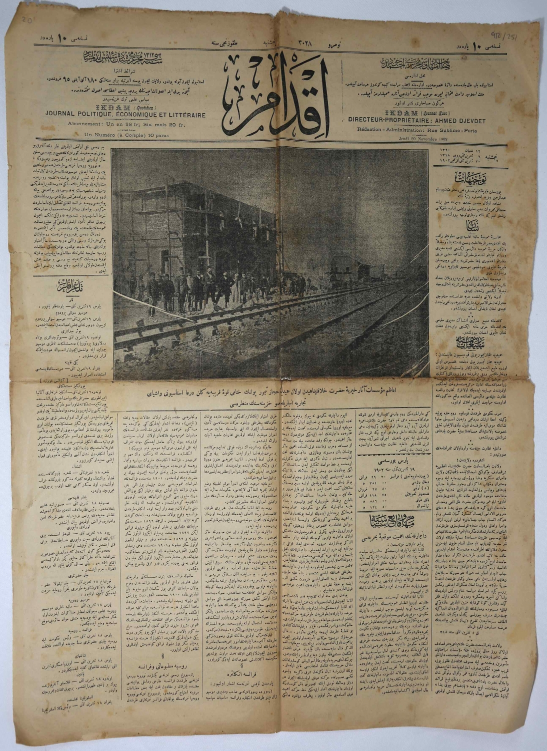 Osmanlıca İkdam Gazetesi, Kapak: Hicaz Demiryolu, Sahib u İmtiyaz ve Ser Muharriri: Ahmed Cevdet, 19 Şubat 1320, 20 Novembre 1902 tarihli, 2 sayfa, 62x46 cm.