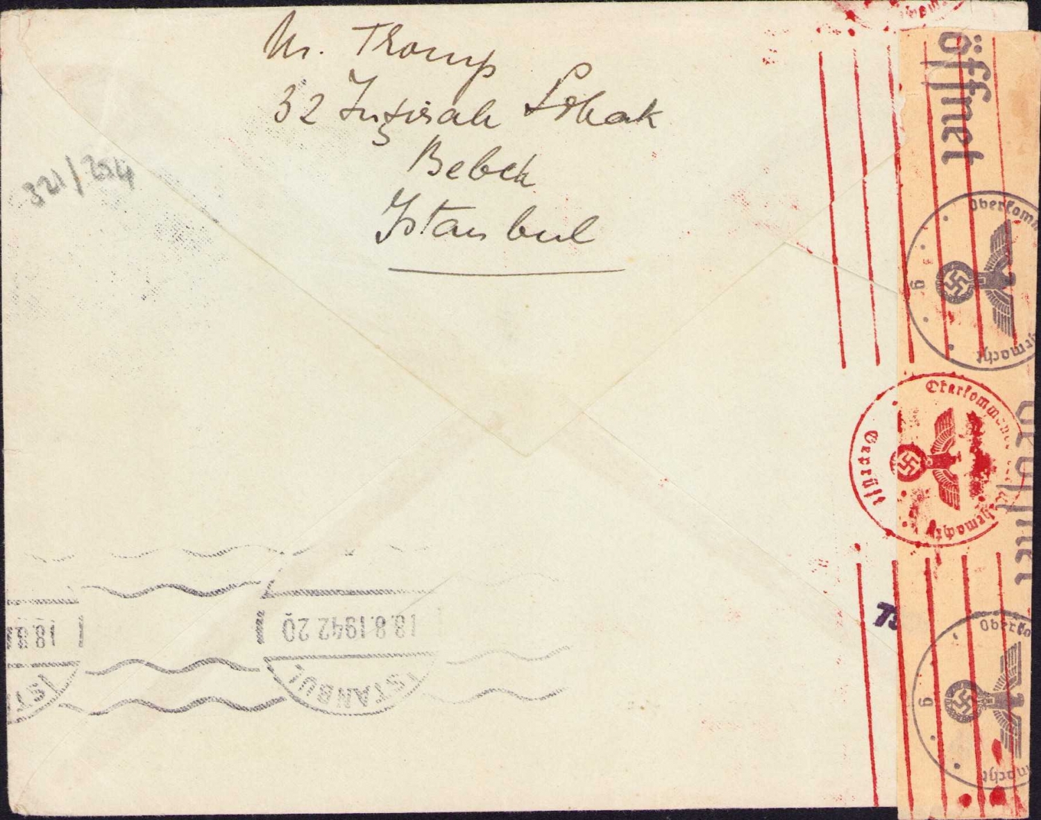 İstanbul'dan Hollanda'ya gönderilmiş mektup zarfı, Nazi Almanyası damgalı, 1942 tarihli, 15x12 cm.