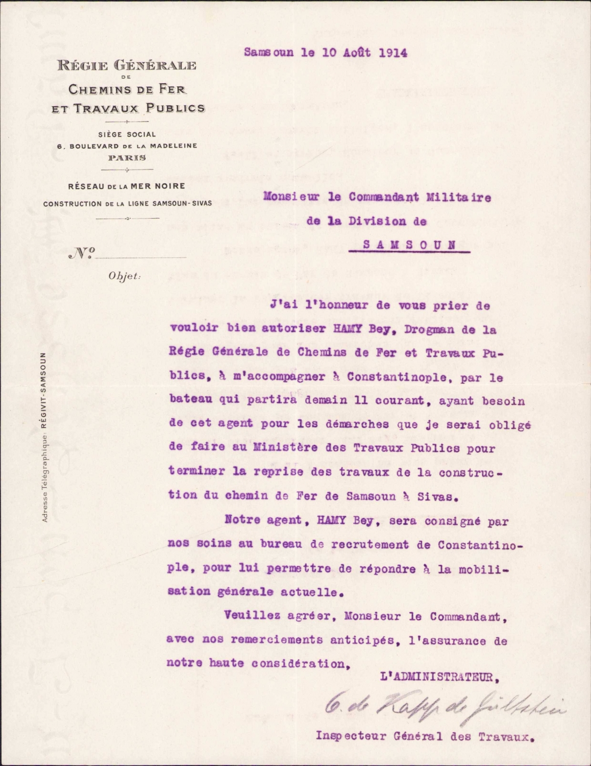Sivas-Samsun demiryolu Hami Bey'e gönderilmiş resmi evrak, 1914 tarihli, Fransızca, 21x27 cm.