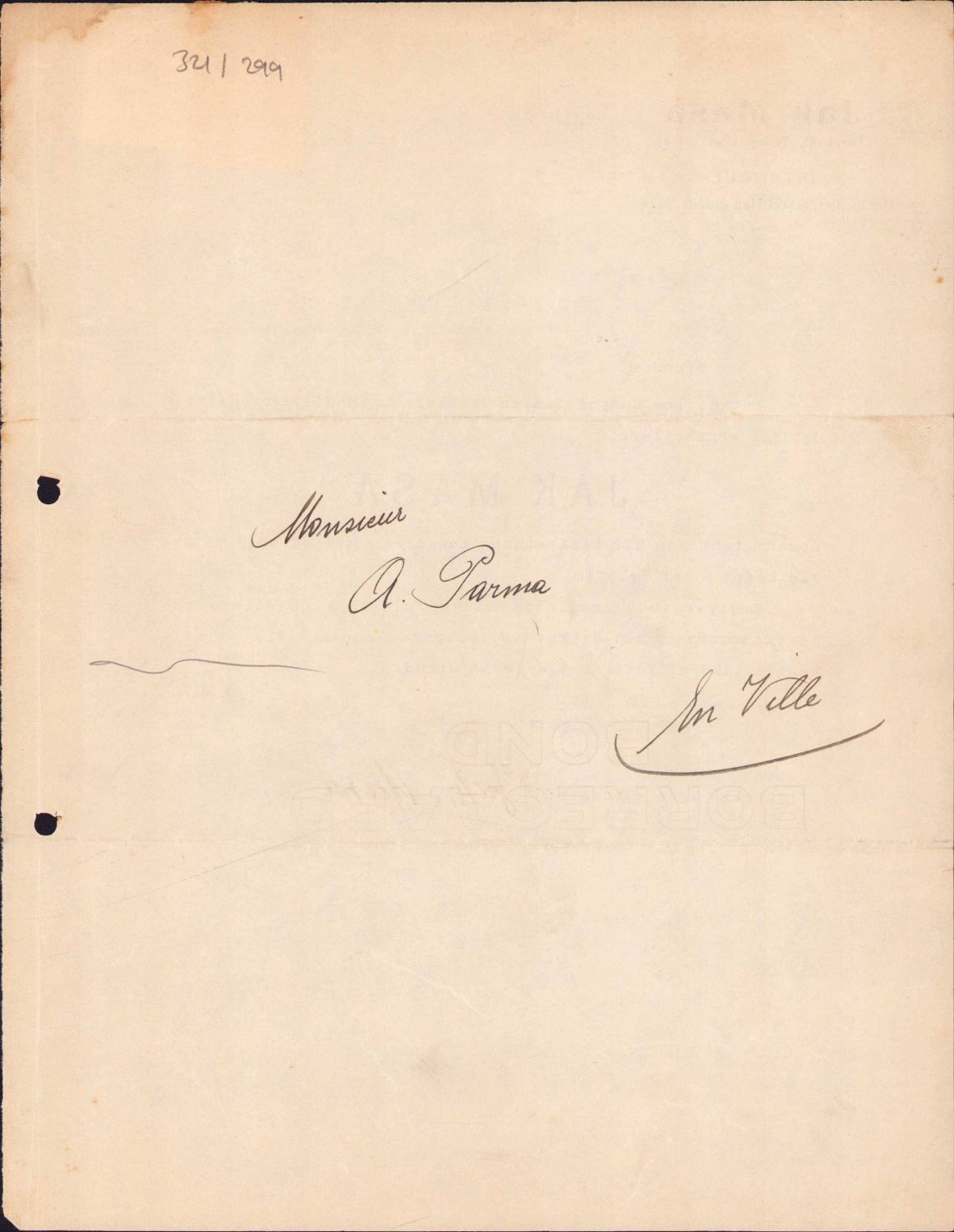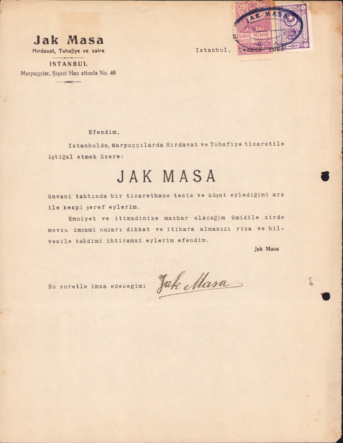 Jak Masa Hırdavat, Tuhafiye ve Saire İstanbul antetli doküman, Jak Masa imzalı, damgalı ve pullu, 23x29,5 cm.