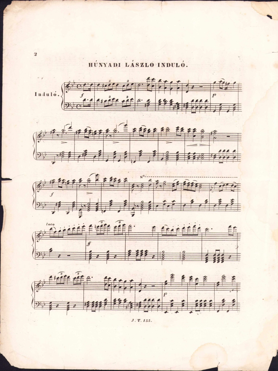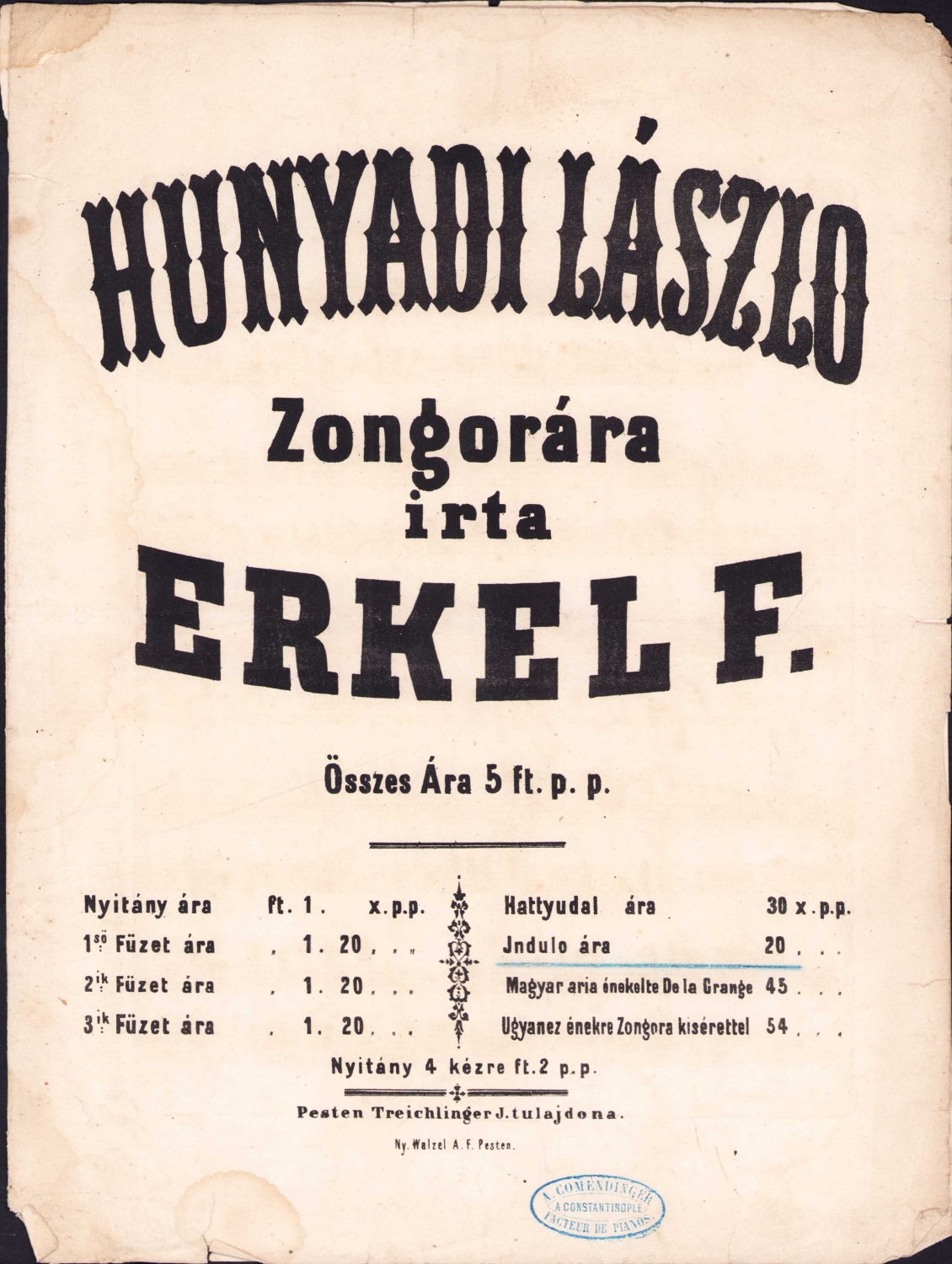 Macarca Matbu Nota, Hunyadi Laszlo Zongorara İrta Erkel F., A. Comendiger damgalı, 3 sayfa, kenarları haliyle, 25,5x34,5 cm.